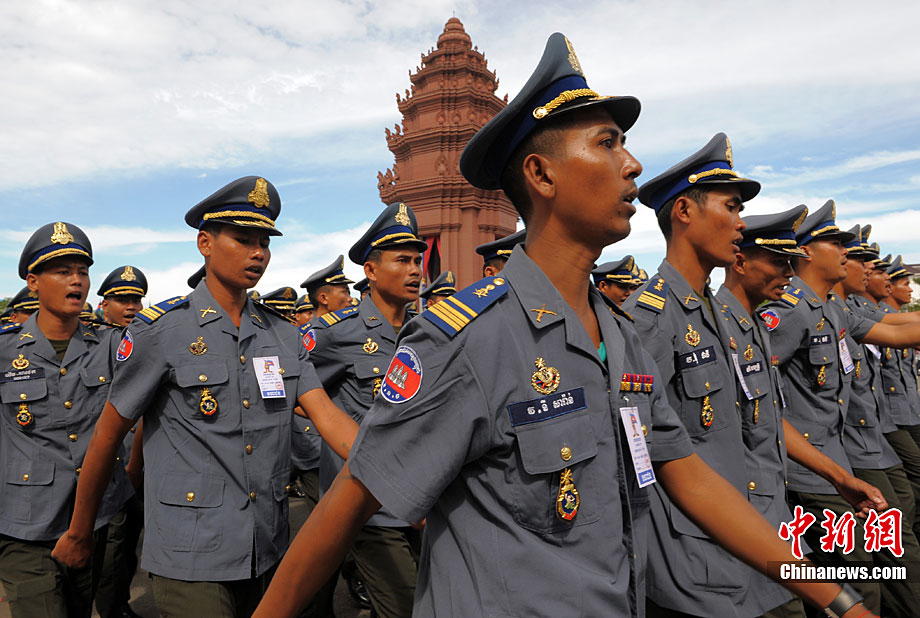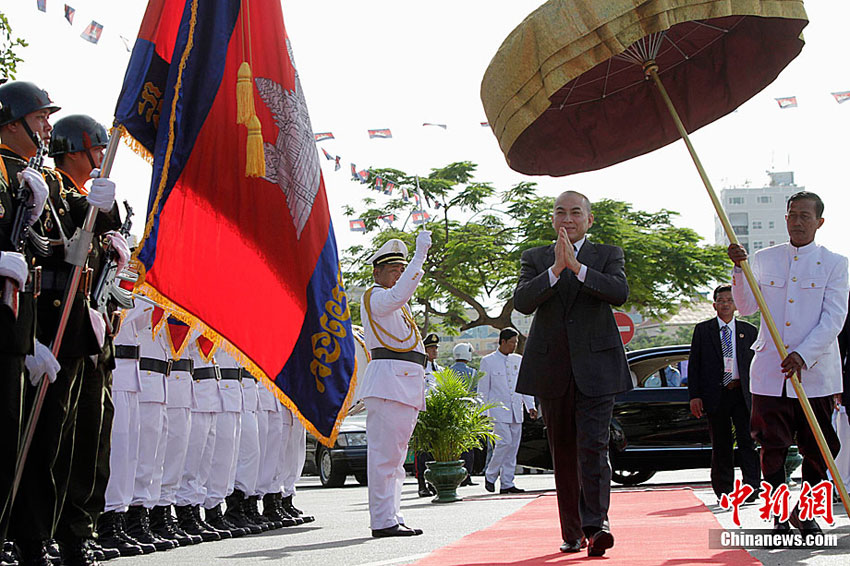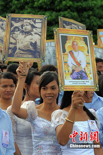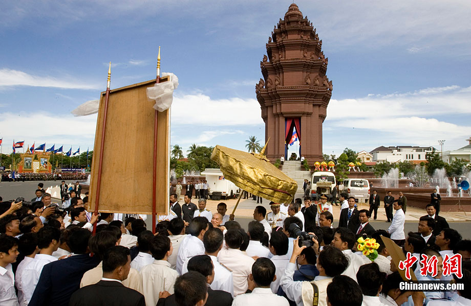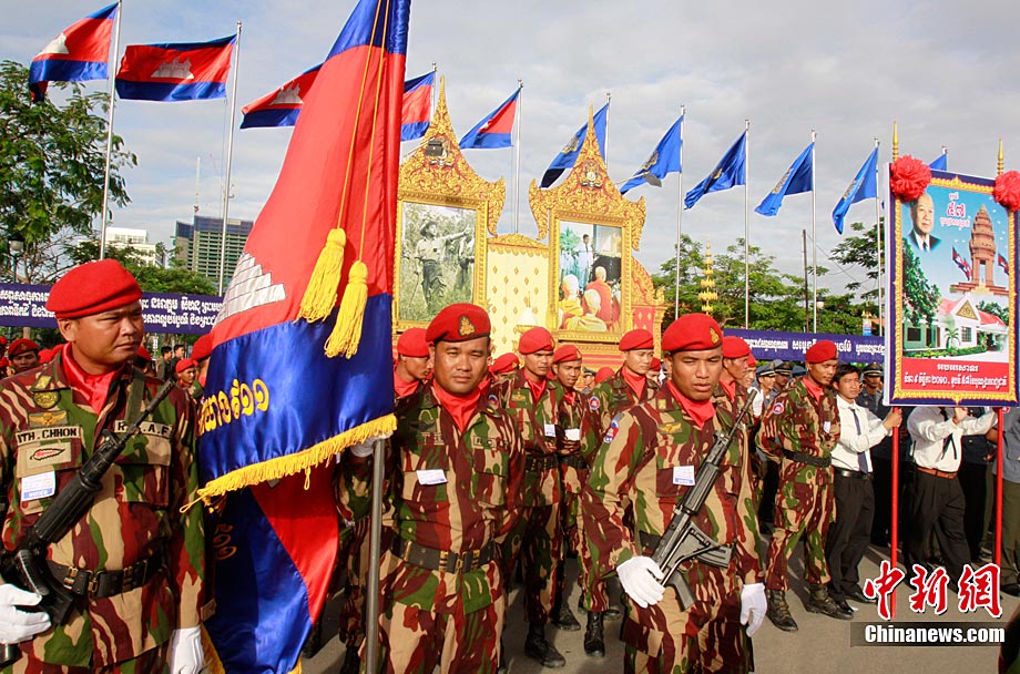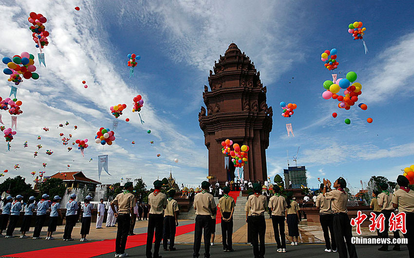 11月9日,工作人員在獨立節(jié)慶祝儀式上放飛彩球。當(dāng)天,柬埔寨在金邊獨立紀(jì)念碑廣場舉行盛大儀式,熱烈慶祝國家獨立57周年。柬埔寨國王西哈莫尼、國會主席韓桑林、政府首相洪森等政要以及各國駐柬使節(jié)和各界代表約2萬人出席儀式。