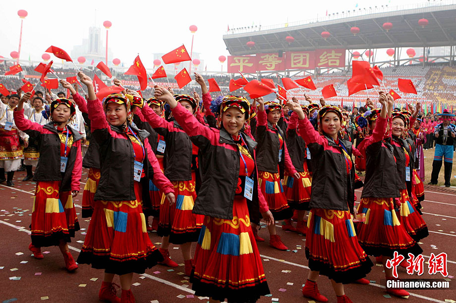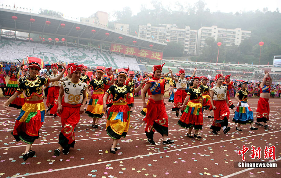 11月10日,四川省第13屆少數(shù)民族體育運動會在攀枝花拉開帷幕。來自涼山州、甘孜州、阿壩州、樂山市、雅安市等10個市州以及西南民族大學(xué)、成都體育學(xué)院共12支代表隊1066名運動員,將參加陀螺、民族式摔跤、田徑等9個競賽項目7天的比賽。本次運動會是四川歷屆少數(shù)民族運動會規(guī)模最大的一次,所有項目均可免費觀看。中新社發(fā) 劉忠俊 攝