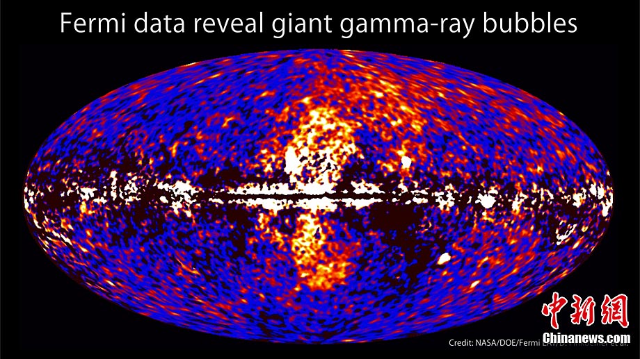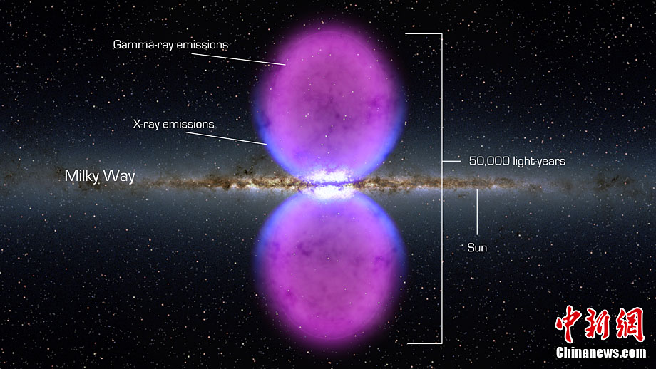 科學(xué)家日前最新探測(cè)發(fā)現(xiàn)銀河系中心溢出高能量放射線形成的兩個(gè)巨大氣泡,并認(rèn)為這兩個(gè)巨大的氣泡源自一個(gè)超大質(zhì)量黑洞的噴發(fā)。每個(gè)神秘的宇宙氣泡結(jié)構(gòu)直徑跨越25000光年,兩個(gè)氣泡連接起來(lái)可覆蓋可見(jiàn)夜空一半的區(qū)域,它們噴射著伽馬射線(高能量波長(zhǎng)光線)。