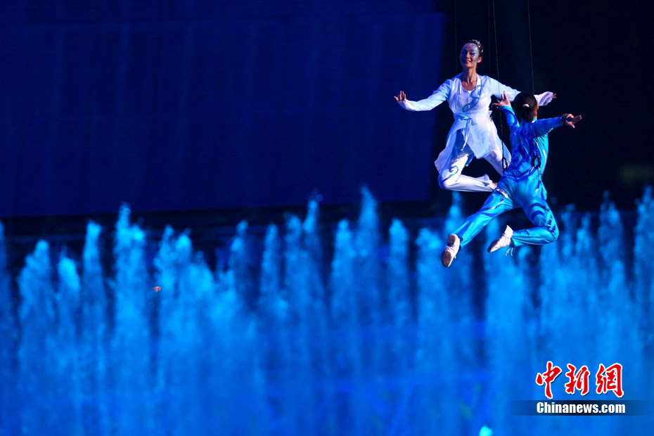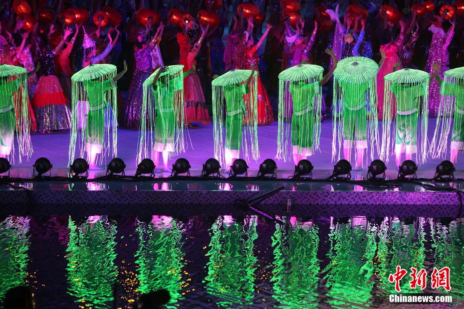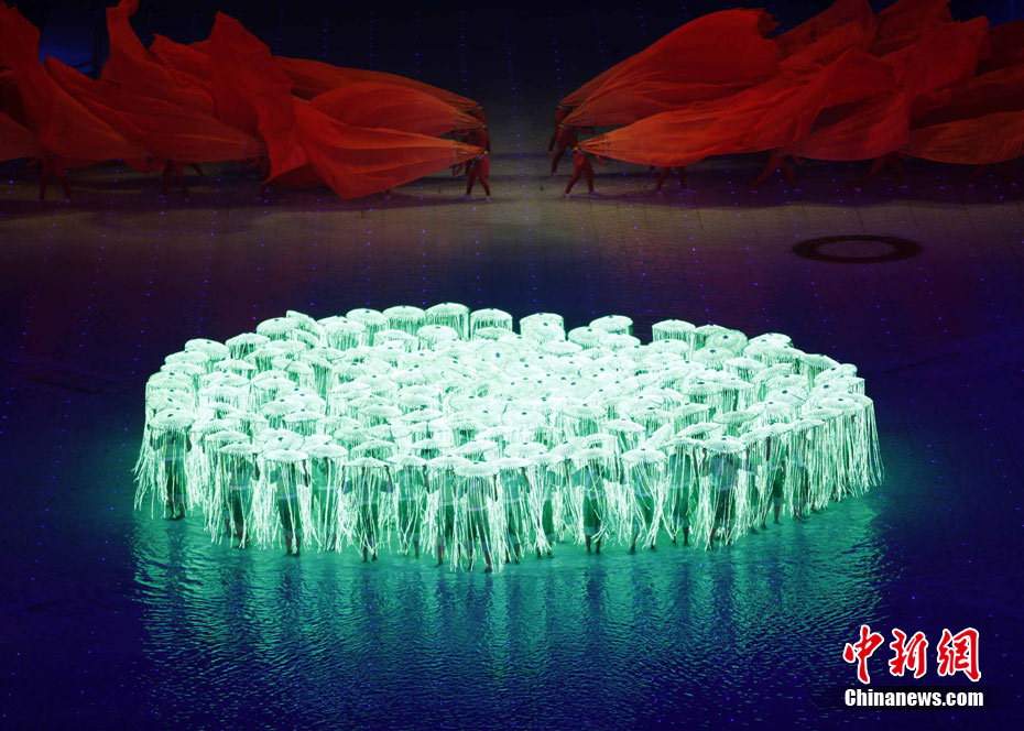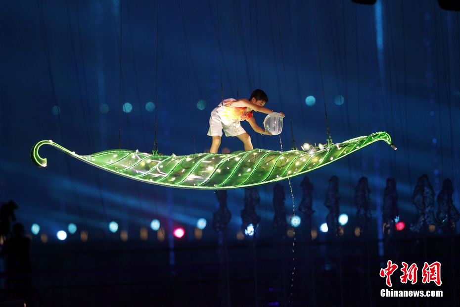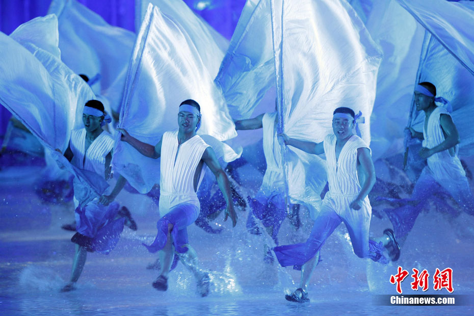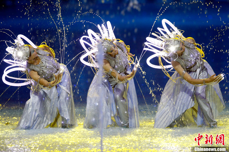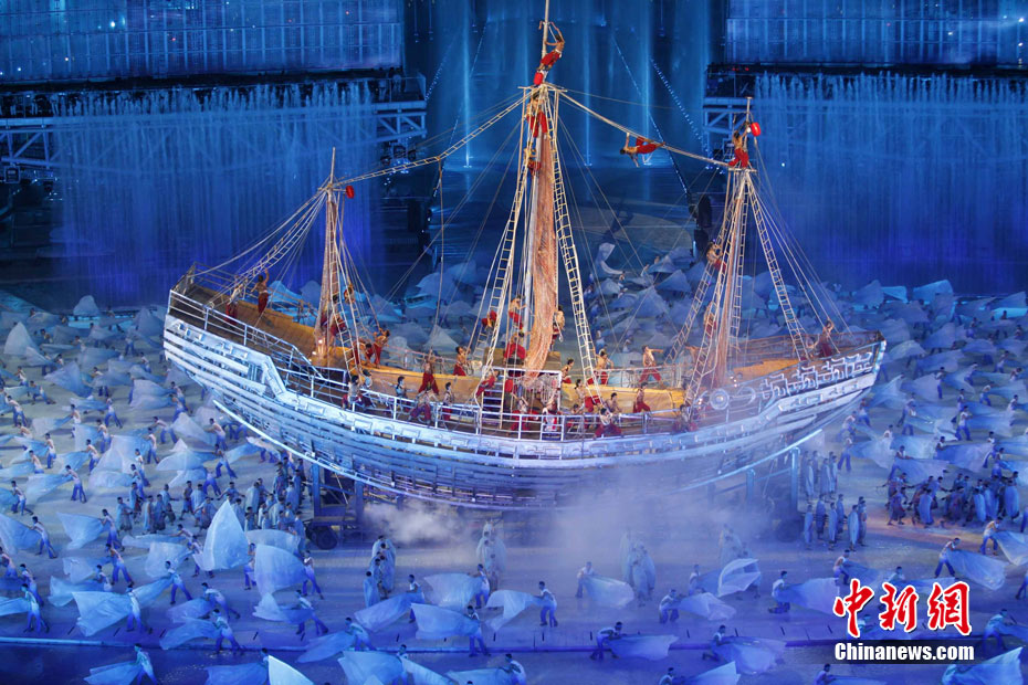 11月12日晚,第16屆亞運(yùn)會(huì)開幕式在廣州海心沙舉行,宏大、絢麗的文藝匯演《啟航》給亞洲以及世界觀眾帶來藝術(shù)盛宴。水是廣州亞運(yùn)開幕式最主要的創(chuàng)意元素,幕式的表演從一滴水到汪洋大海,從一葉扁舟到巨型帆船,從一汪情水到滔天巨浪。演員們用各種表演手段盡情展現(xiàn)水的魅力,表達(dá)水是生命之源、滋養(yǎng)萬物、呵護(hù)人類文明的精神內(nèi)涵,令人嘆為觀止。中新社記者 杜洋 攝