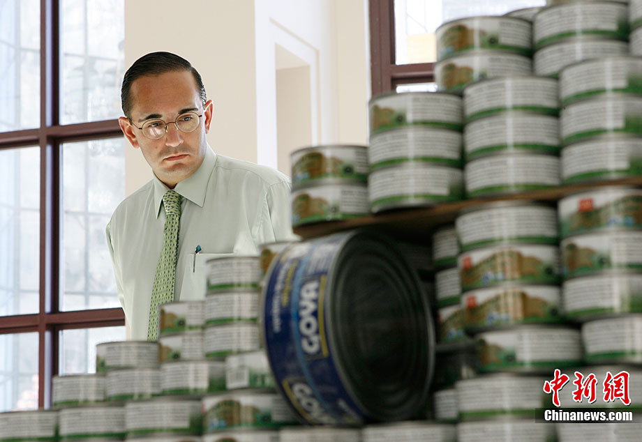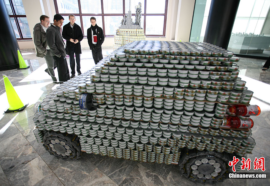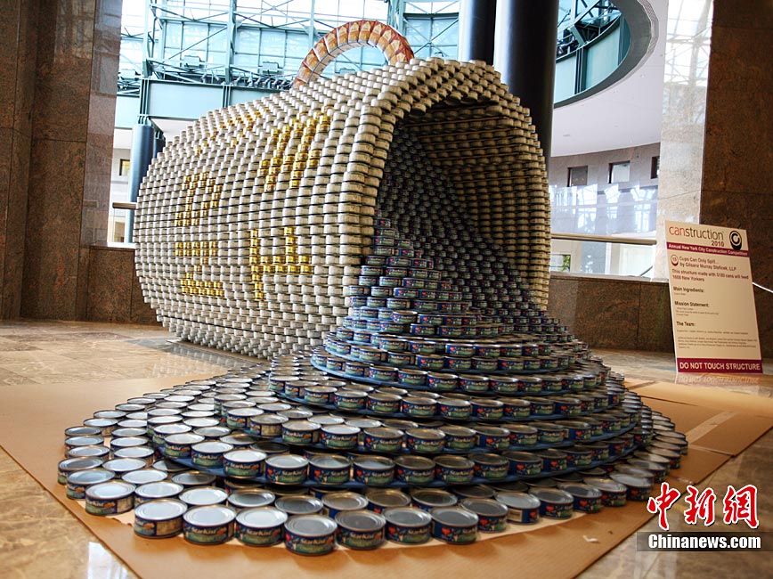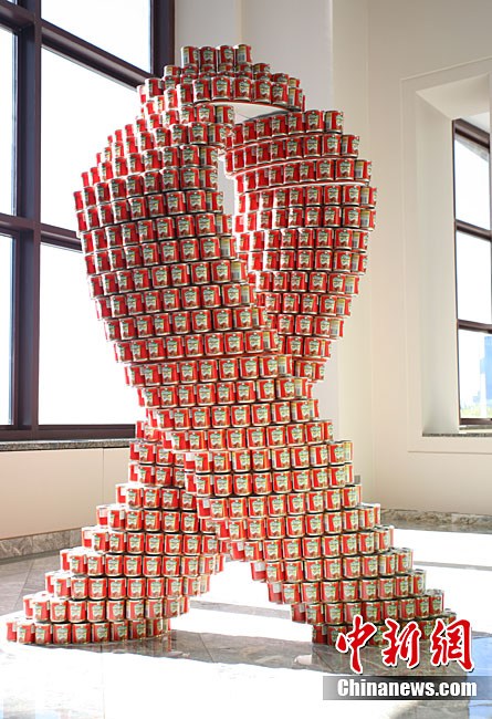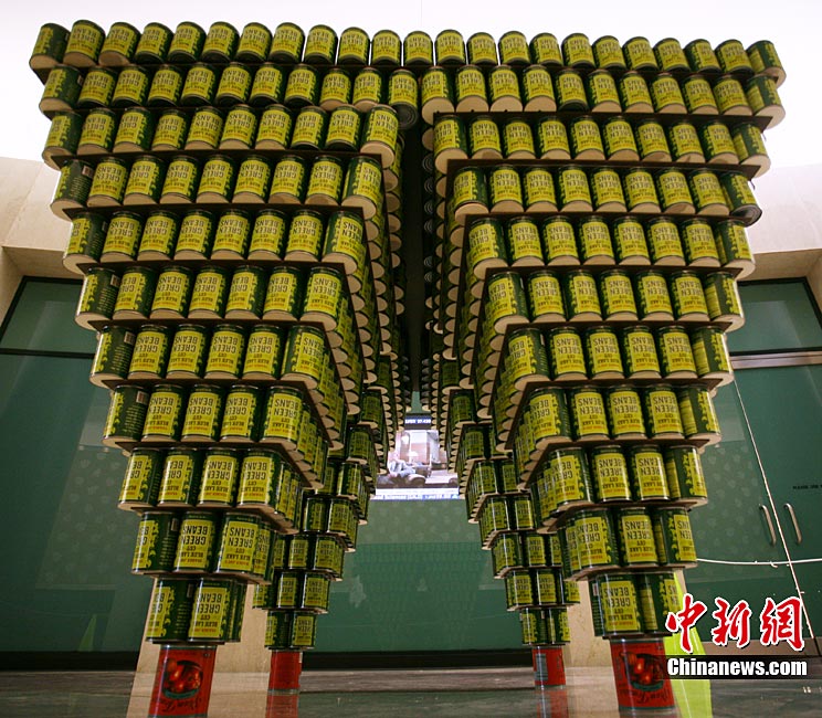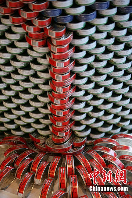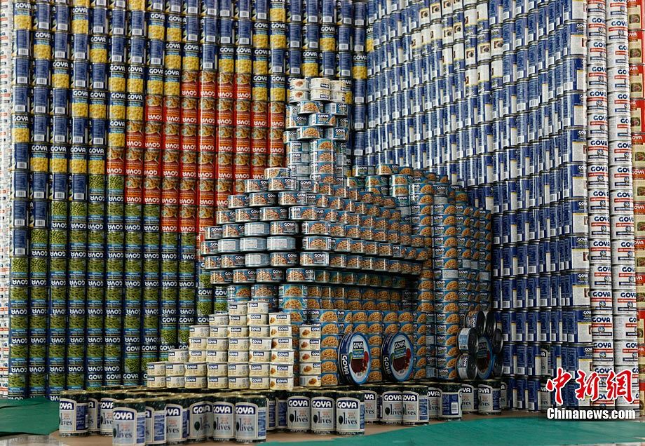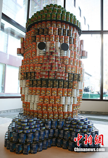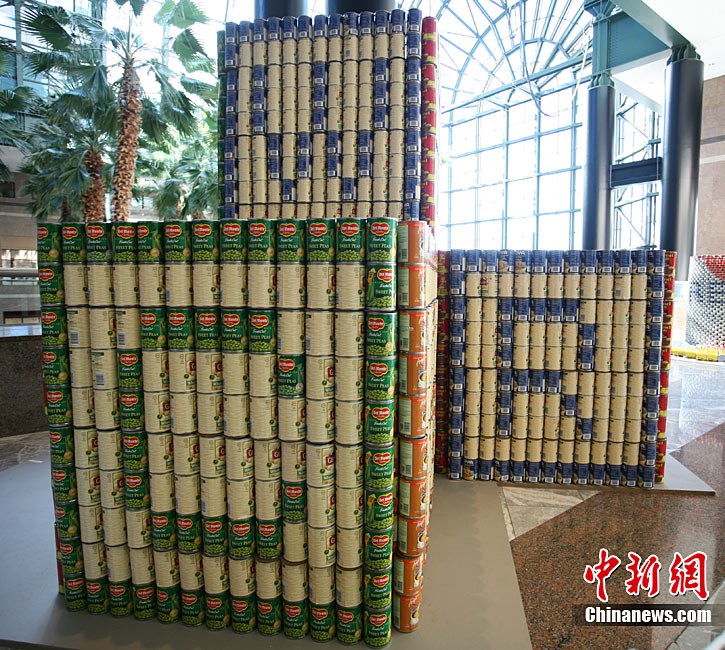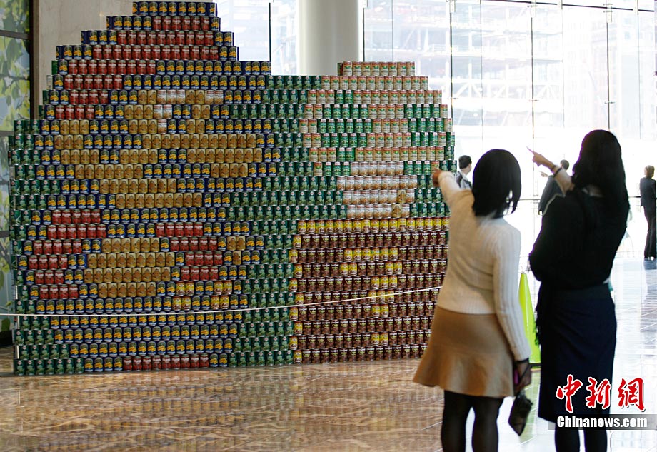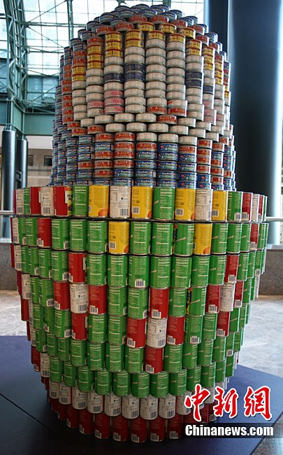 當(dāng)?shù)貢r(shí)間11月11日,美國(guó)紐約世界金融中心的冬園展出了一組用各種食品罐頭組合成的雕塑作品。此次展覽結(jié)束后,這些作品將被拆除,所有的罐頭都將被捐給慈善機(jī)構(gòu)“城市收獲”,用來(lái)援助仍在忍受饑餓的人。