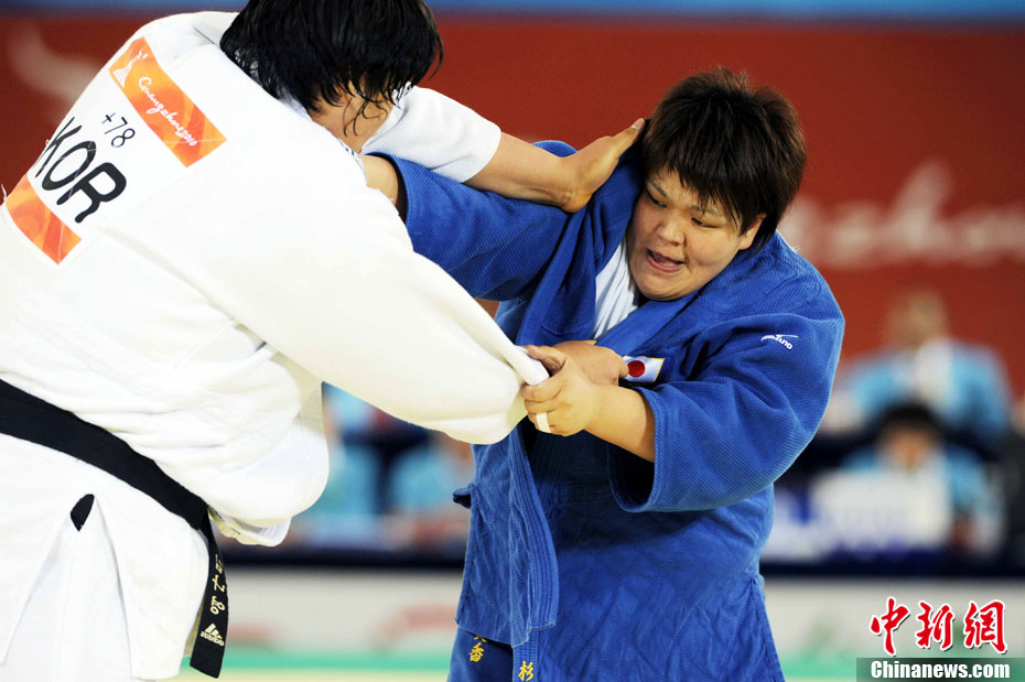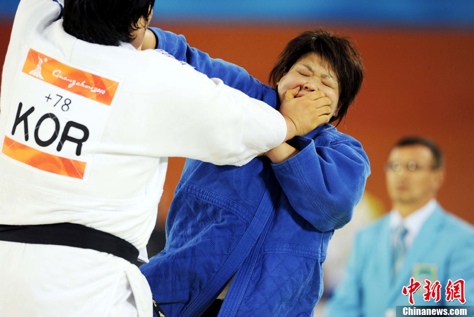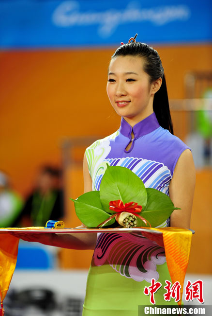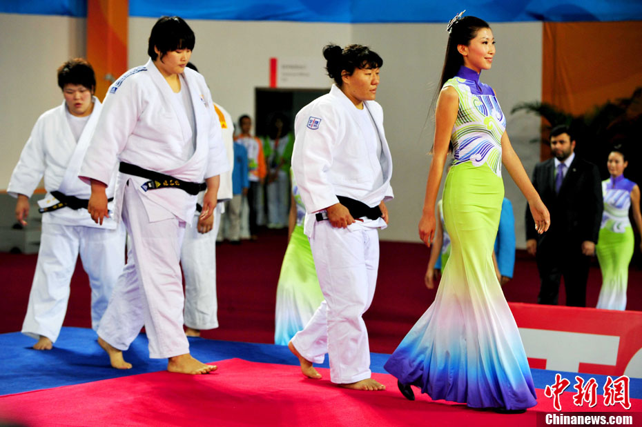 11月13日,廣州亞運開賽第一天,柔道項目當(dāng)日產(chǎn)生4枚金牌,分別被韓國、日本選手奪得。出席頒獎儀式的亞運中國“美人魚”格外養(yǎng)眼愉悅。中新社記者 陳文 攝