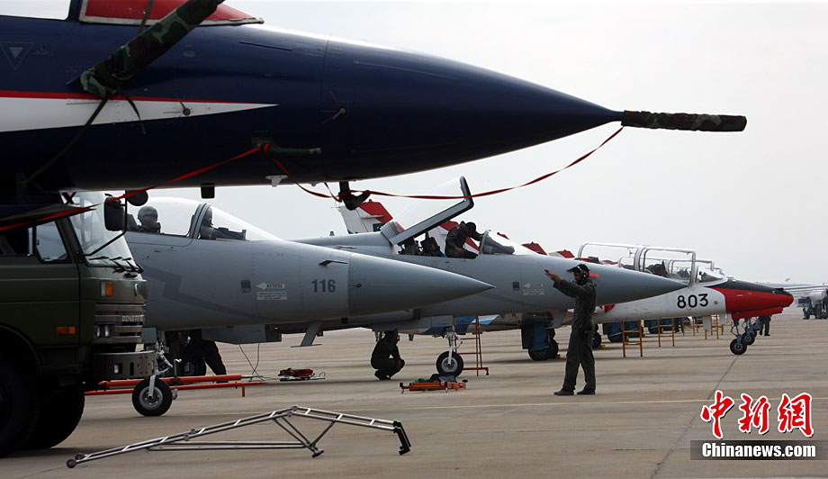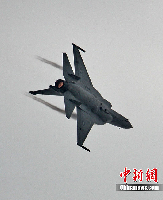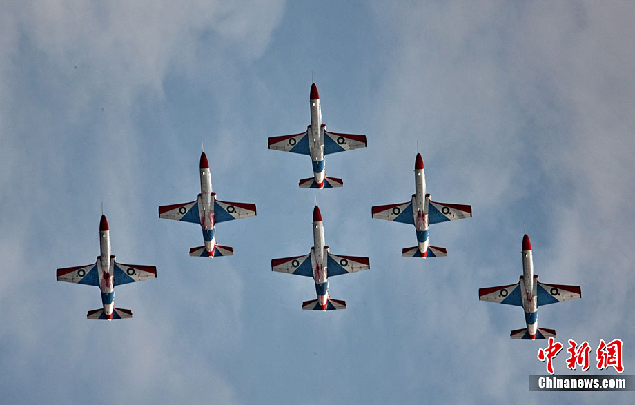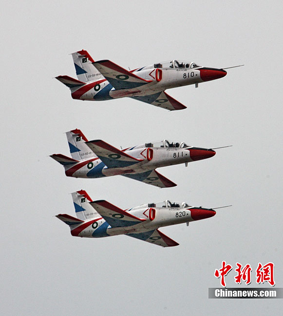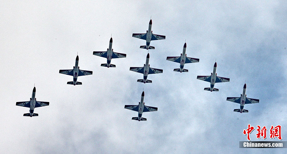 11月13日下午,巴基斯坦空軍“雄獅”飛行表演隊(duì)的飛行員駕駛k8教練機(jī)進(jìn)行九機(jī)密集隊(duì)形飛行訓(xùn)練。昨日,巴基斯坦空軍“雄獅”飛行表演隊(duì)抵達(dá)珠海,這支表演隊(duì)由10架K8教練機(jī)和一架C130運(yùn)輸保障機(jī)組成。由外國(guó)飛行員駕駛“中國(guó)造”飛機(jī)在中國(guó)航展上表演,必將是一道優(yōu)美而又特別的風(fēng)景。圖為巴基斯坦空軍“雄獅”飛行表演隊(duì)的飛行員駕駛k8教練機(jī)進(jìn)行九機(jī)密集隊(duì)形飛行訓(xùn)練。圖片來(lái)源:CNSPHOTO 喬天富 攝