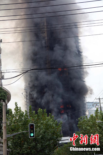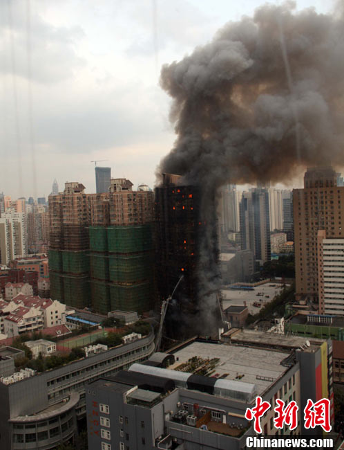 11月15日下午2時15分,上海中心城區(qū)靜安區(qū)正在進(jìn)行外墻裝修的教師公寓的腳手架起火,火警發(fā)生后,公安民警、消防隊員迅速趕往現(xiàn)場救援,到場消防車超過10輛。起火原因和損失狀況正在進(jìn)一步調(diào)查中。中新社發(fā) 張嘉森 攝