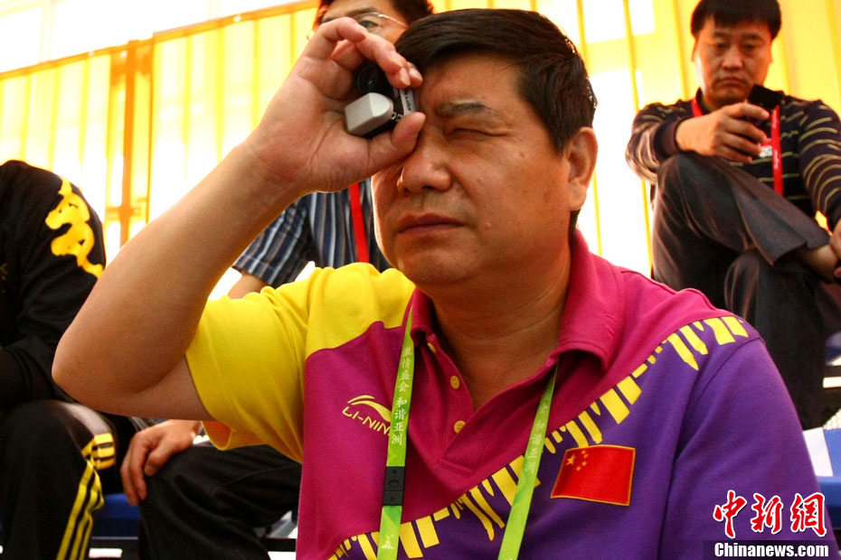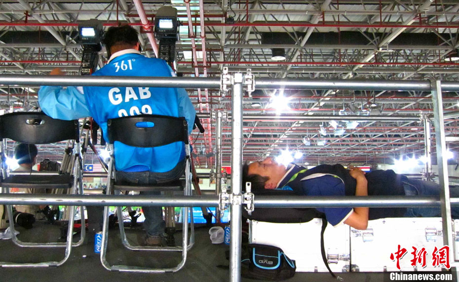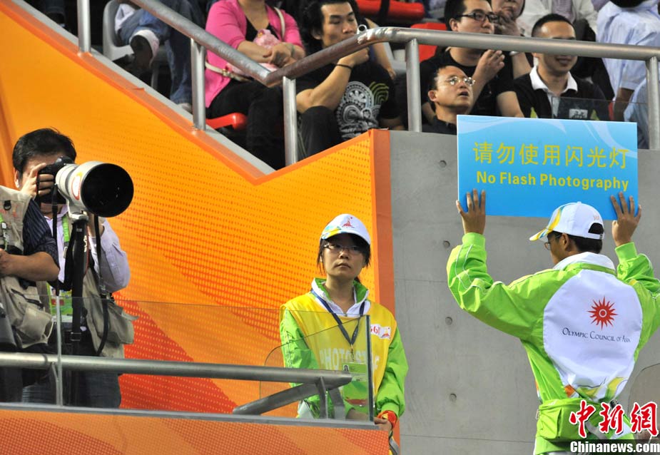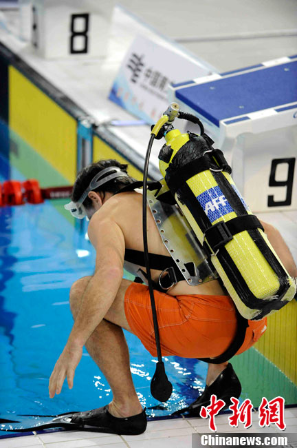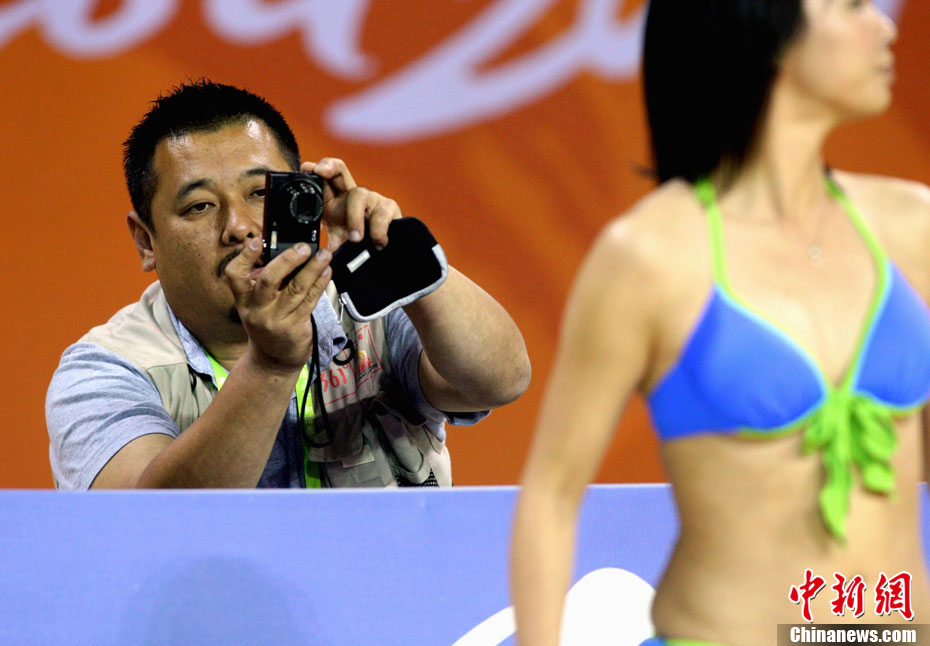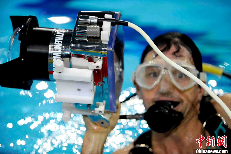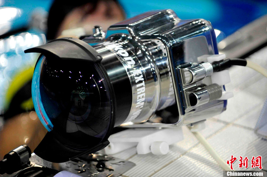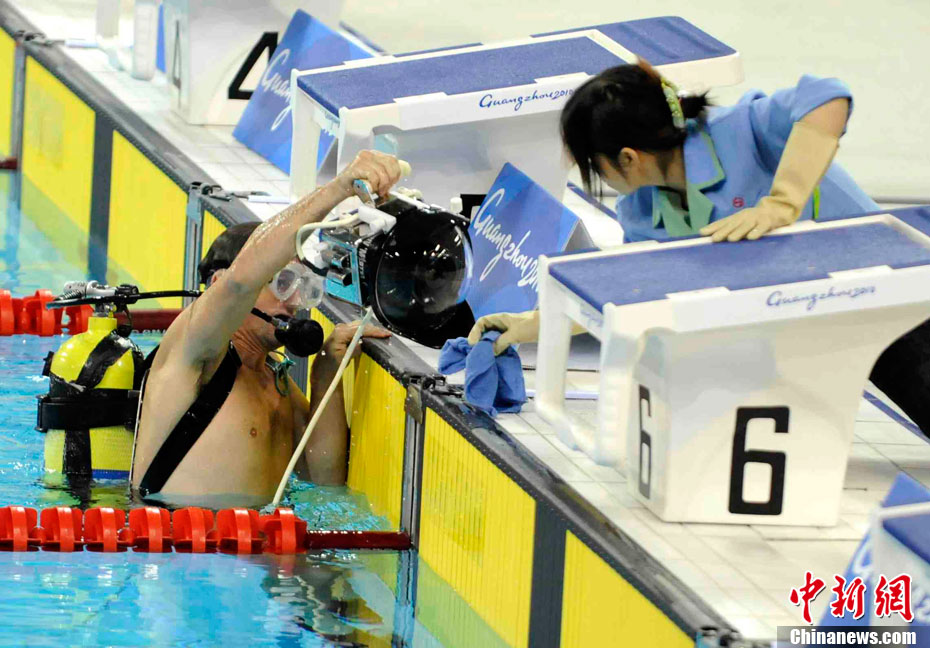 11月16日,廣州亞運(yùn)會(huì)游泳比賽在奧體中心游泳館進(jìn)行,外國攝影記者的水下武器讓人稱奇。中新社記者 王東明 攝