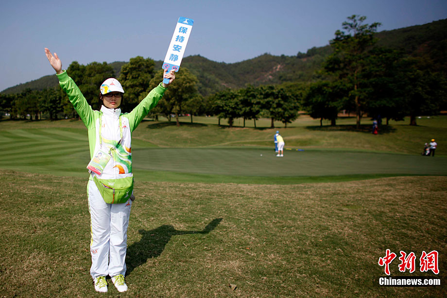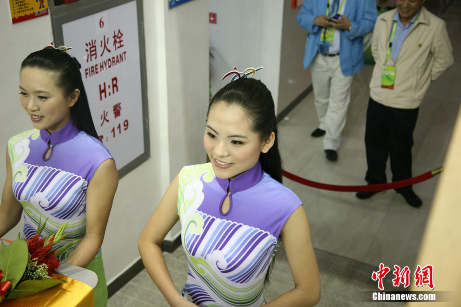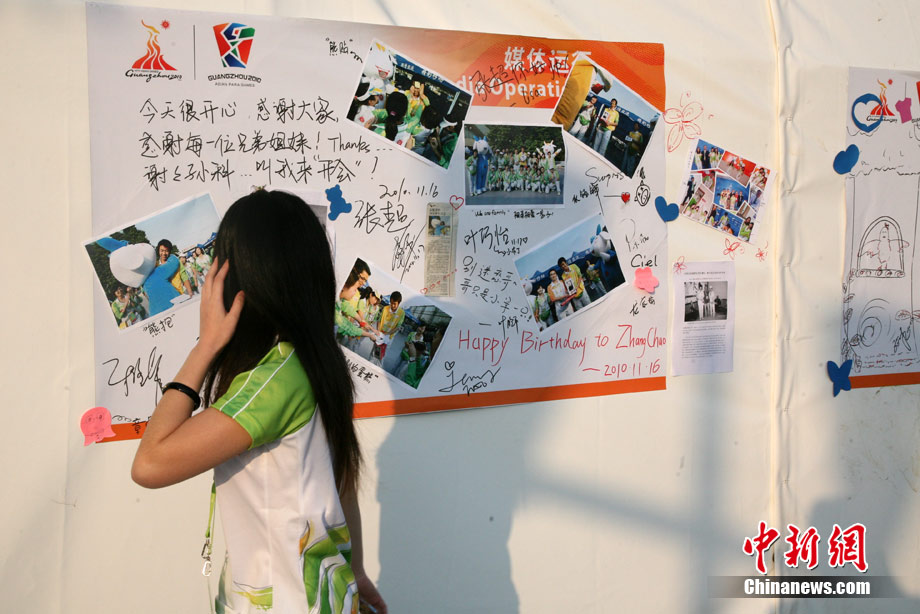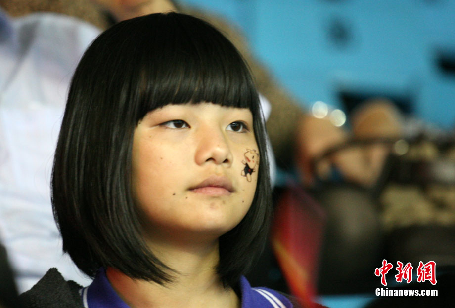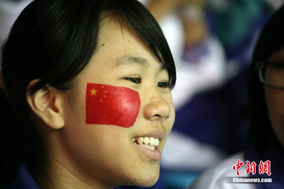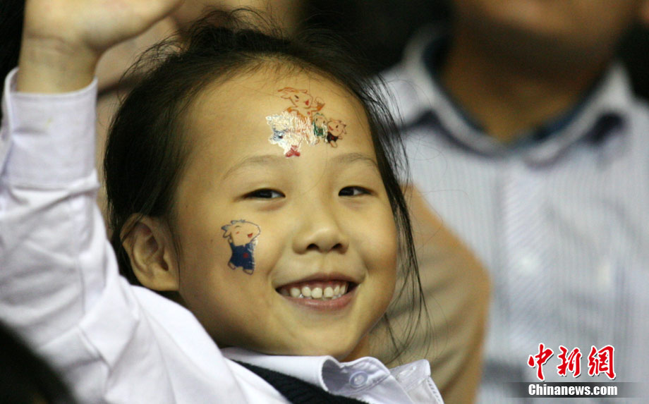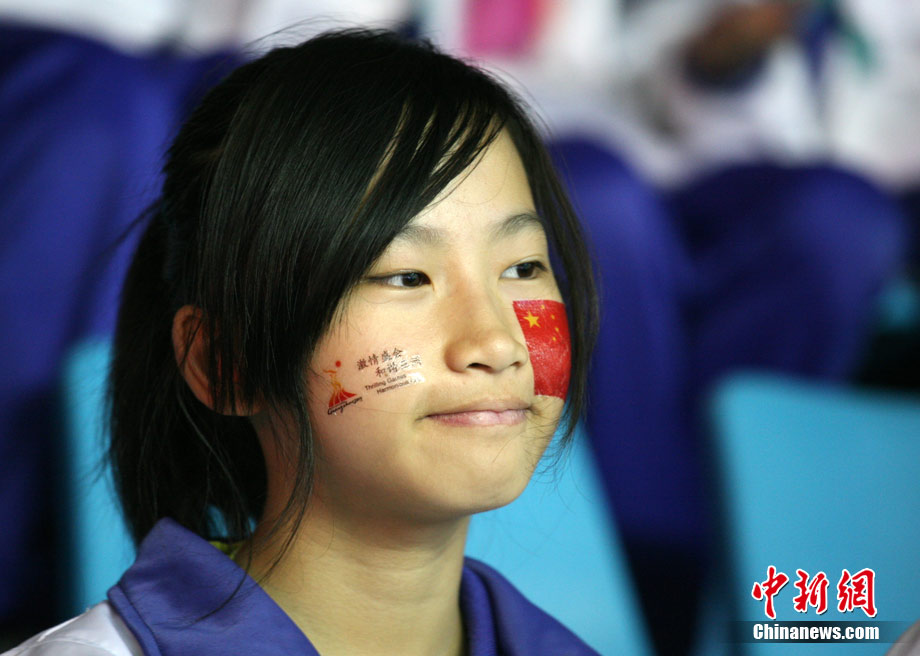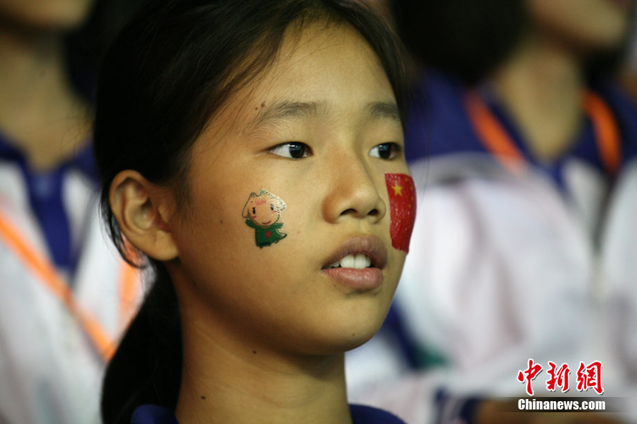 11月17日,2010廣州亞運(yùn)會舉重賽場的看臺上,孩子們臉上貼著亞運(yùn)標(biāo)志觀看比賽。中新社記者 張茵 攝