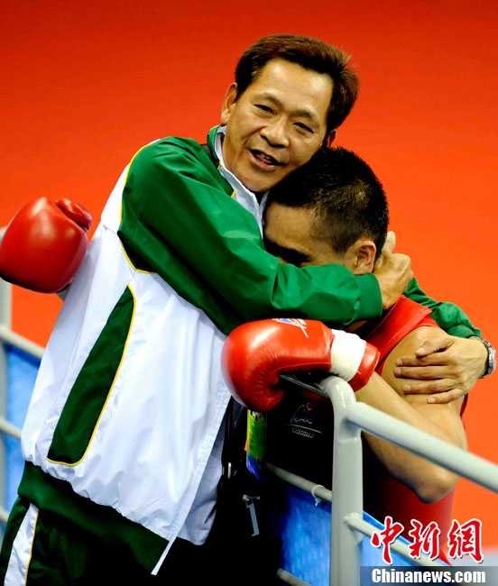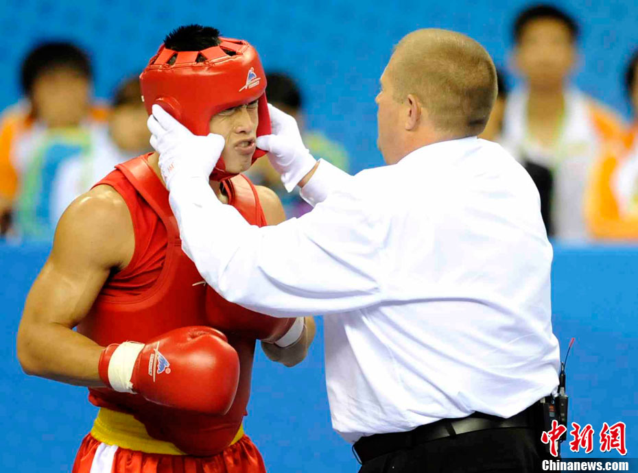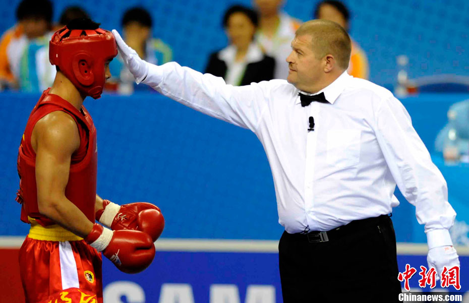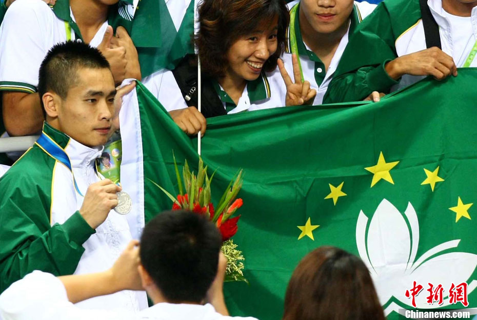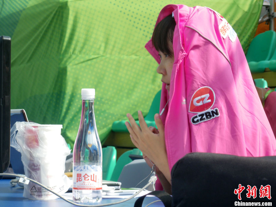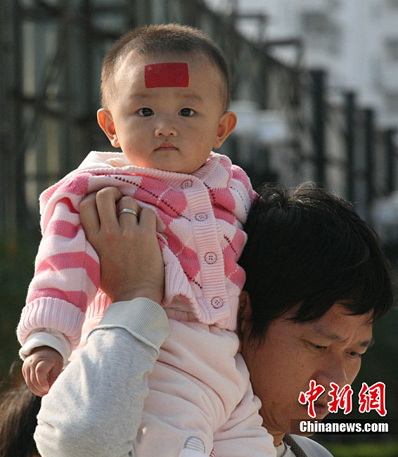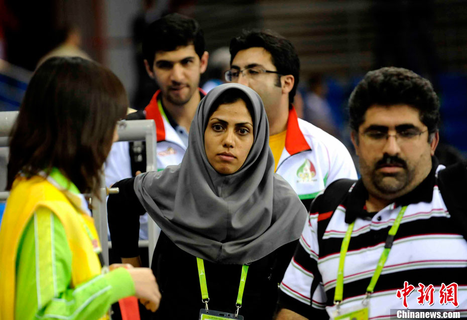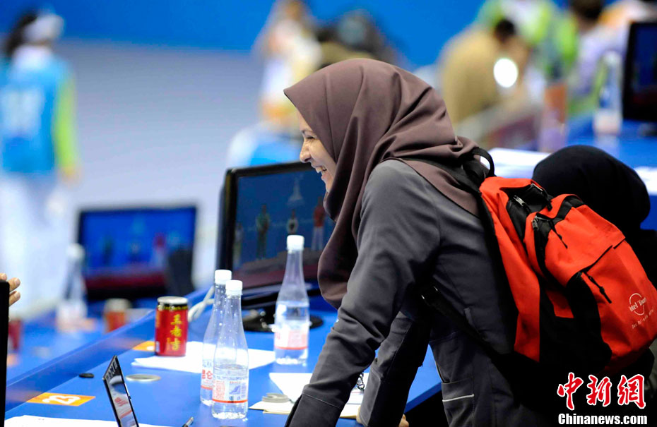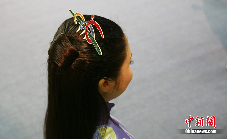 11月17日,2010廣州亞運(yùn)會舉重賽場的看臺上,孩子們臉上貼著亞運(yùn)標(biāo)志觀看比賽。中新社記者 張茵 攝