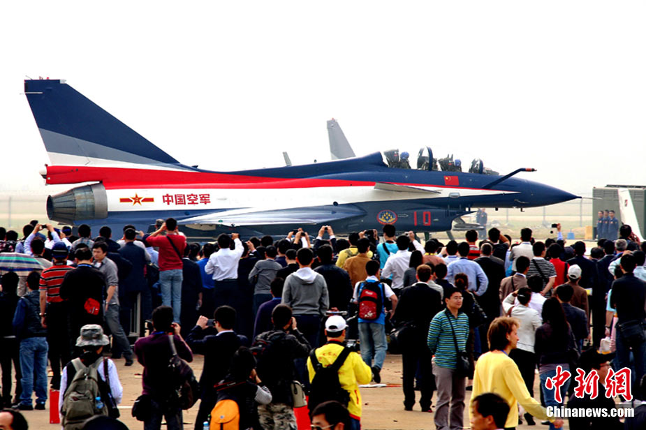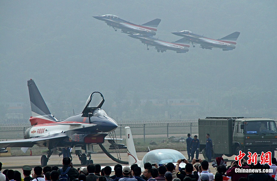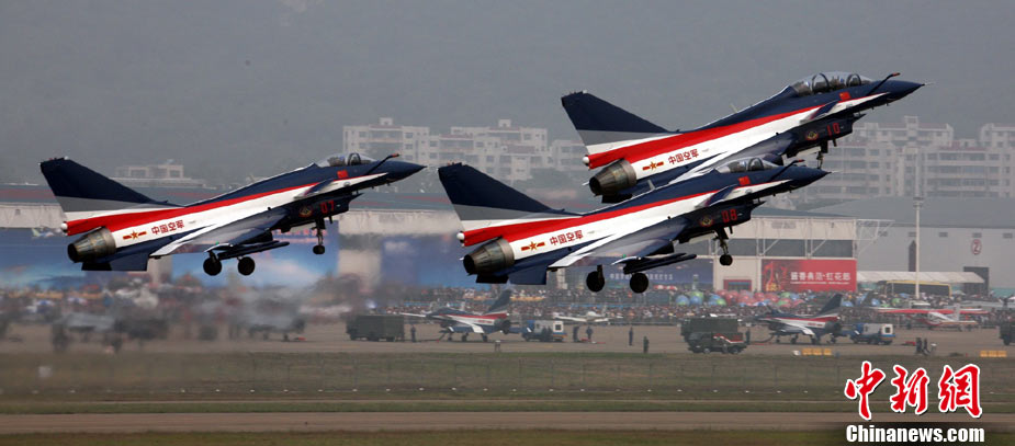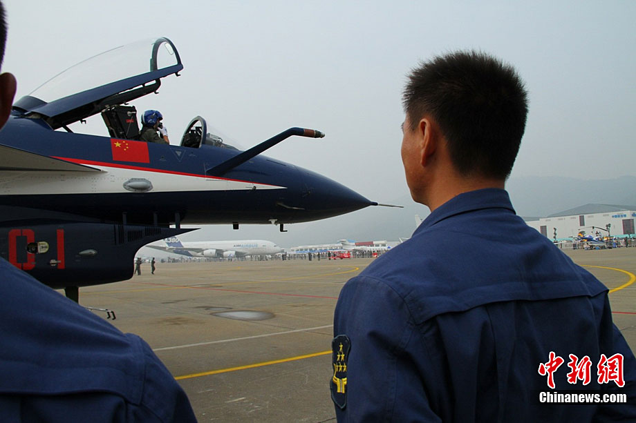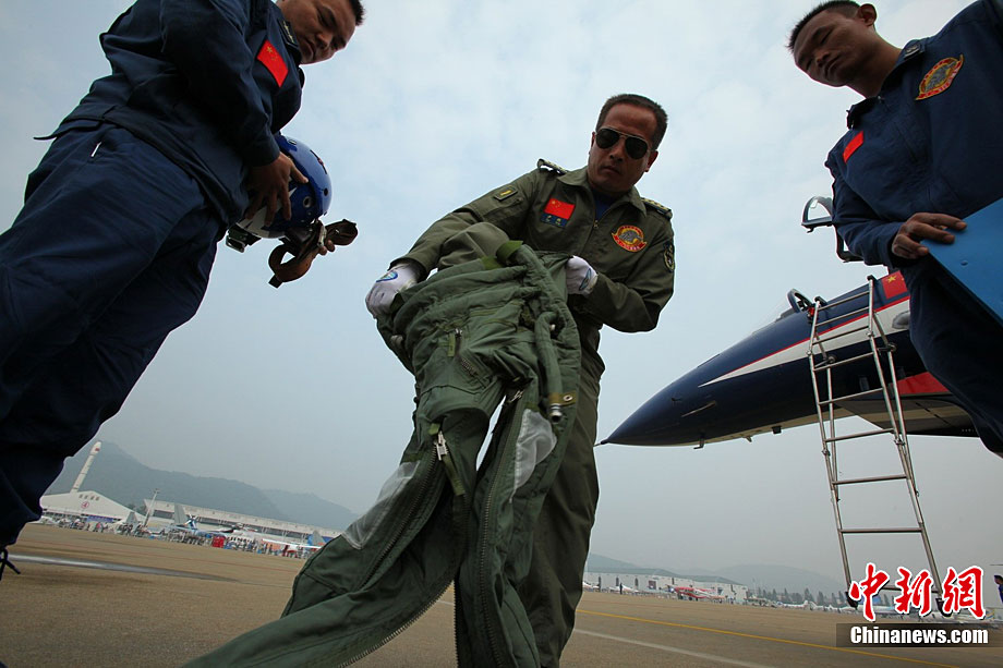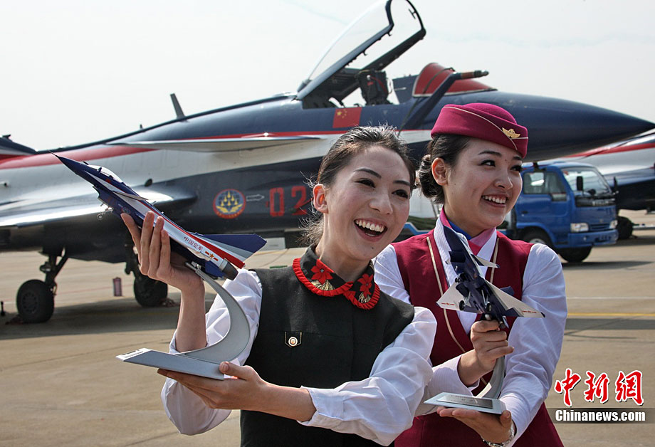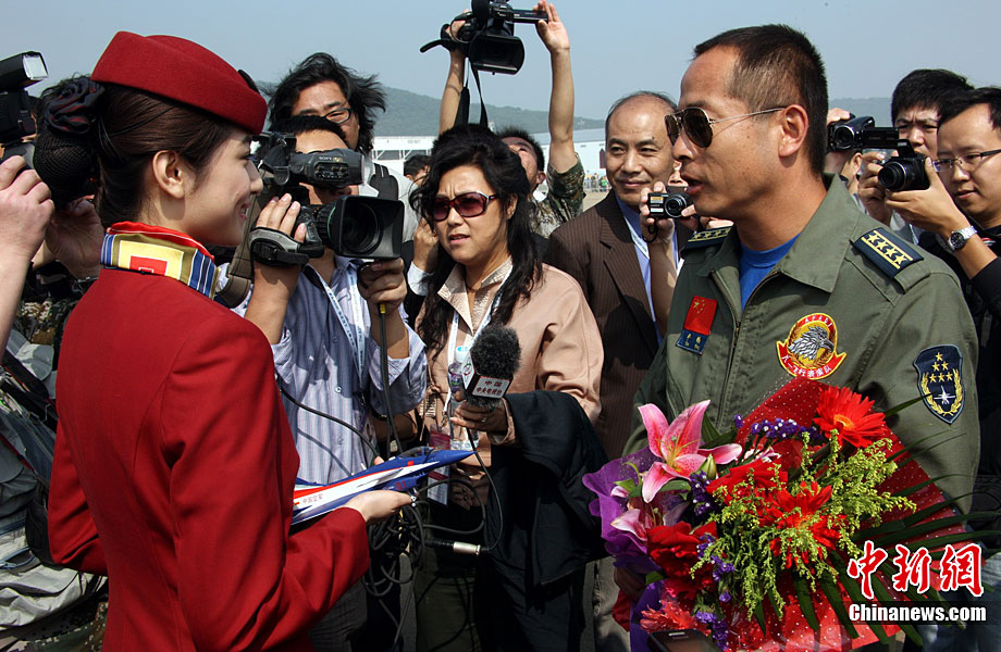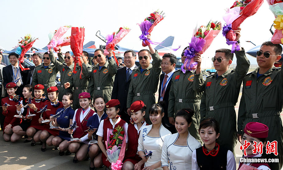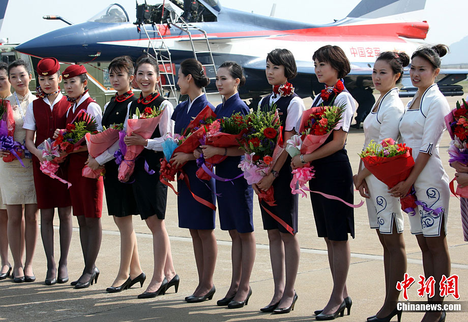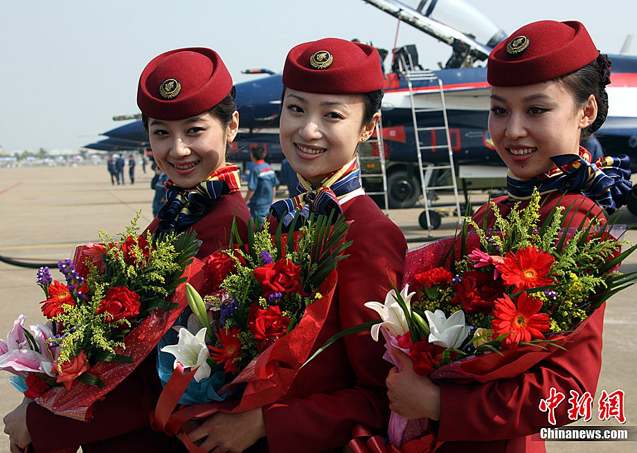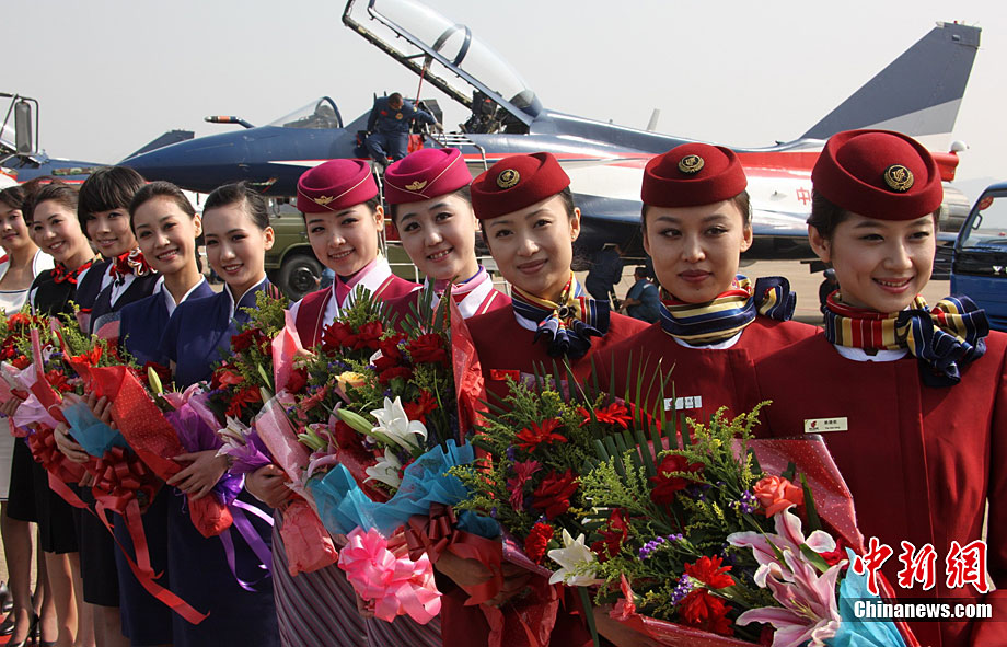 11月17日,在珠海第8屆中國國際航空航天博覽會上,中航公司組織中國獲獎(jiǎng)十佳空中乘務(wù)員,向殲10飛機(jī)總設(shè)計(jì)師、剛做完飛行表演的空軍八一飛行表演隊(duì)的空中英豪們獻(xiàn)上鮮花。圖片來源:CNSPHOTO 喬天富 攝