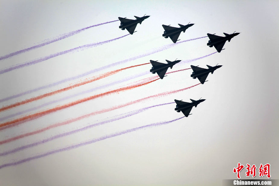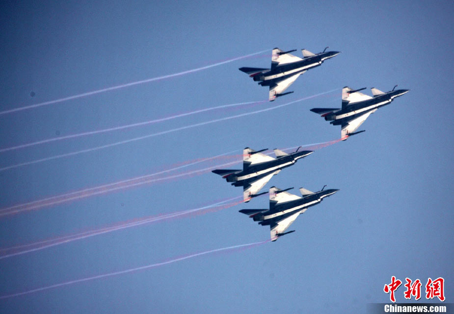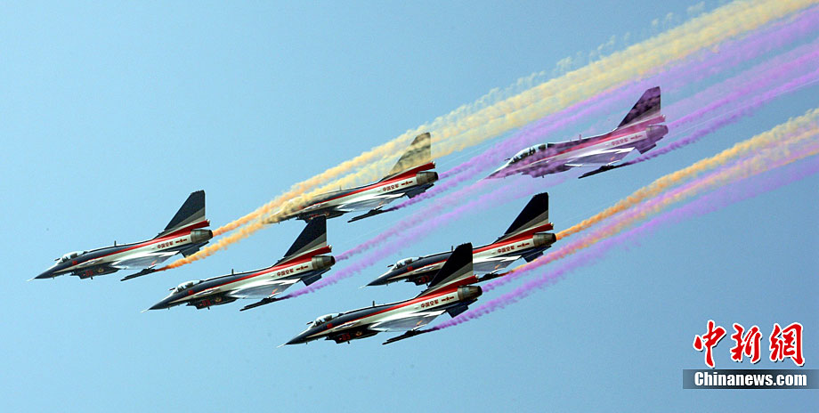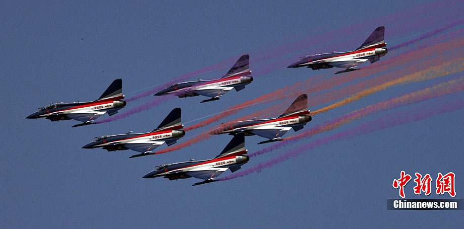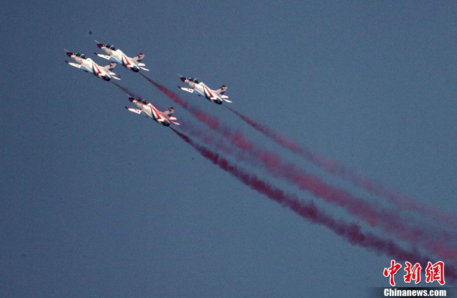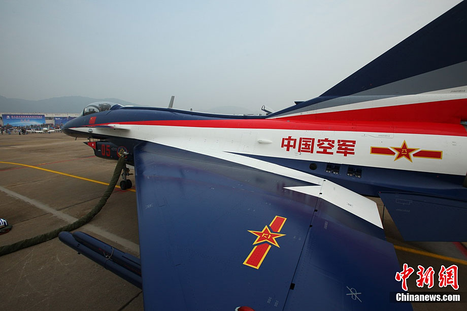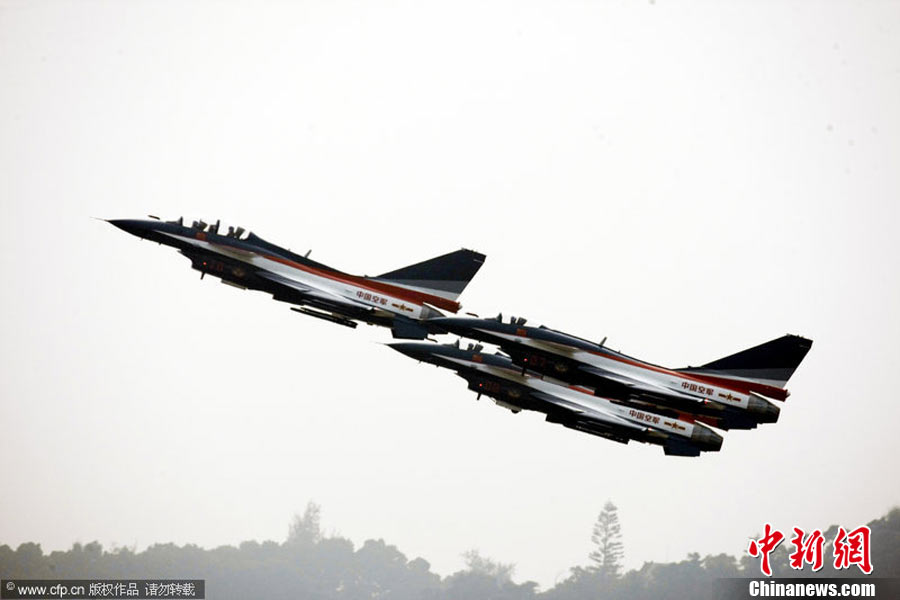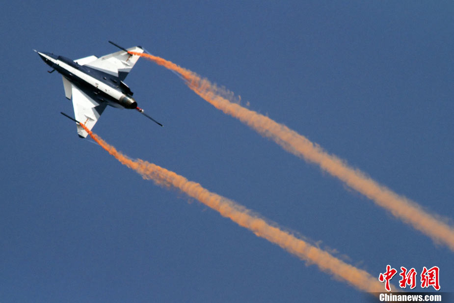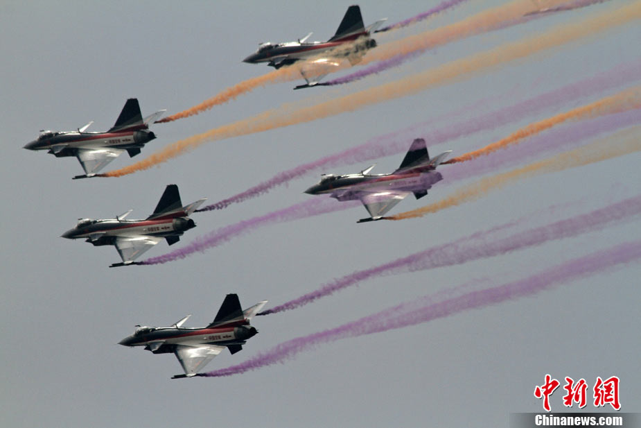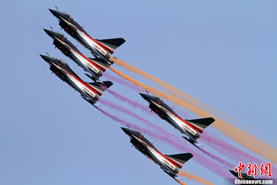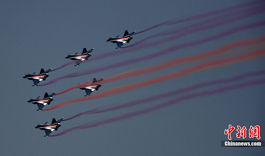 11月17日,在珠海第8屆中國國際航空航天博覽會上,中航公司組織中國獲獎(jiǎng)十佳空中乘務(wù)員,向殲10飛機(jī)總設(shè)計(jì)師、剛做完飛行表演的空軍八一飛行表演隊(duì)的空中英豪們獻(xiàn)上鮮花。圖片來源:CNSPHOTO 喬天富 攝