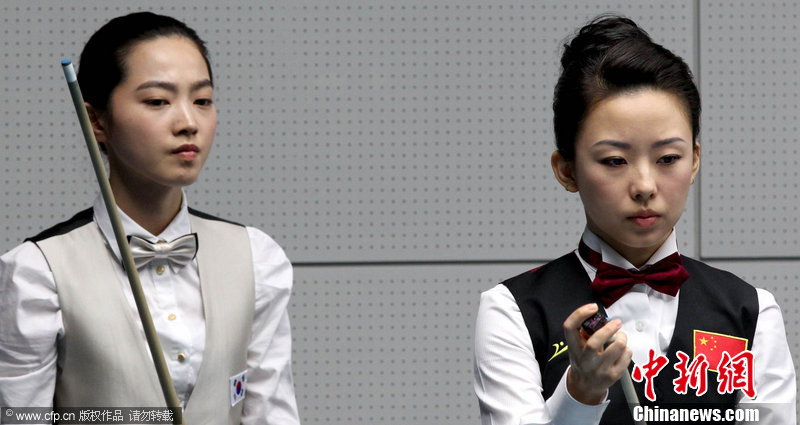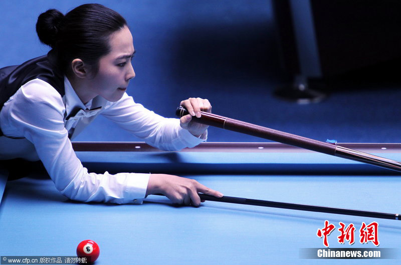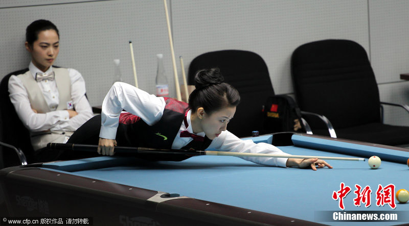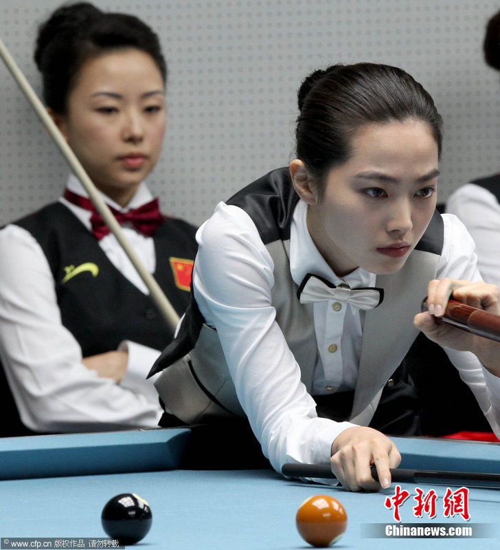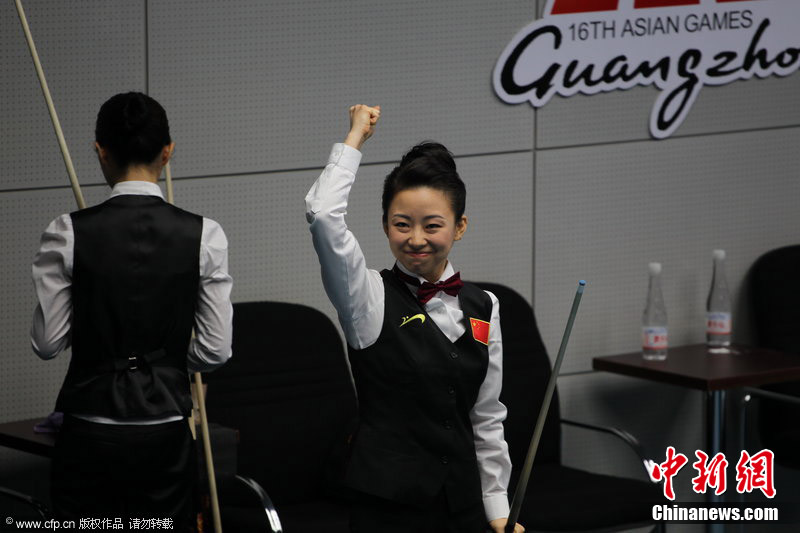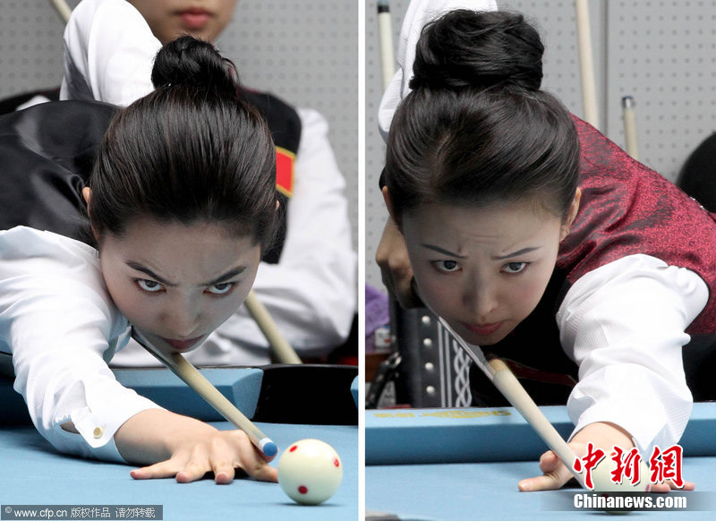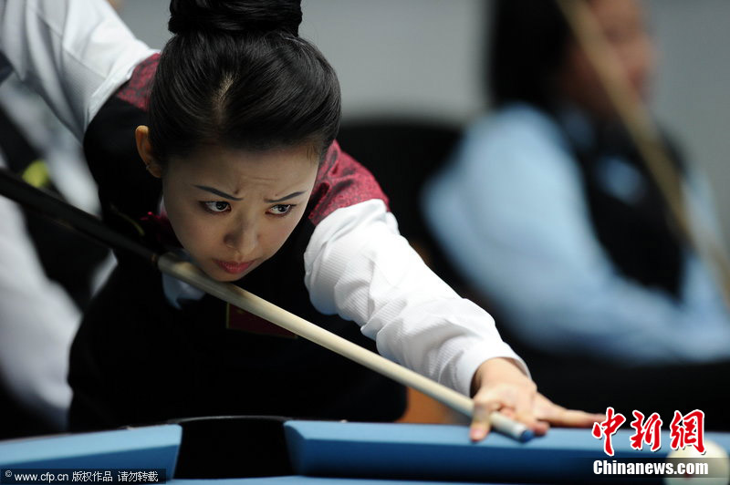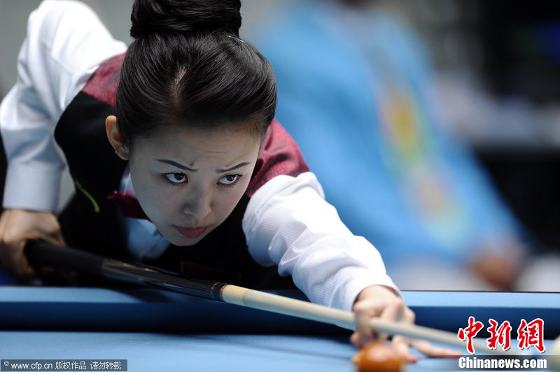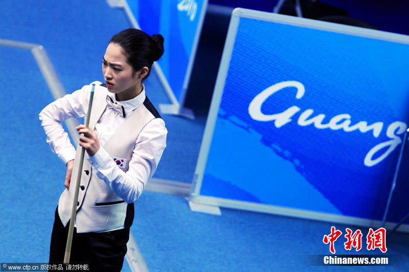 11月18日,2010廣州亞運(yùn)會(huì)女子美式9球單打1/4決賽,兩位公認(rèn)的臺(tái)壇美女展開激烈爭(zhēng)奪,最終,中國(guó)選手潘曉婷以7:6的最終比分戰(zhàn)勝韓國(guó)的車侑藍(lán)(車俞嵐)晉級(jí)下一輪。圖片來源:cfp視覺中國(guó)