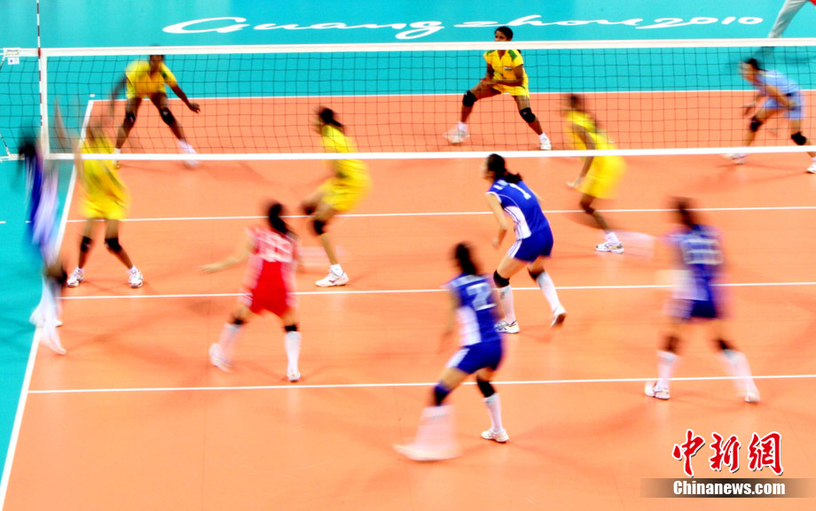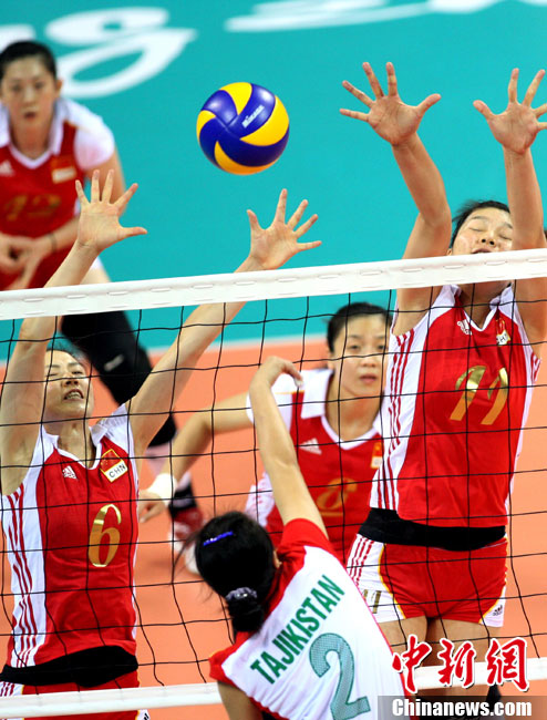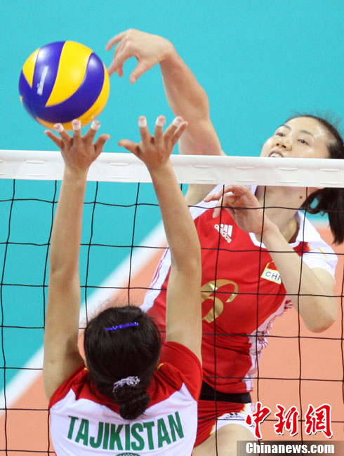 11月18日,廣州亞運(yùn)會(huì)女排比賽全面展開(kāi),中國(guó)隊(duì)首戰(zhàn)迎來(lái)塔吉克斯坦隊(duì)。比賽中,中國(guó)女排隊(duì)員憑借網(wǎng)上的絕對(duì)優(yōu)勢(shì)以3比0戰(zhàn)勝塔吉克斯坦隊(duì)。中新社記者 湯彥俊 攝