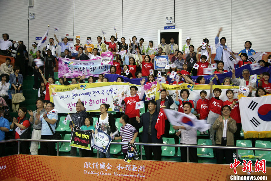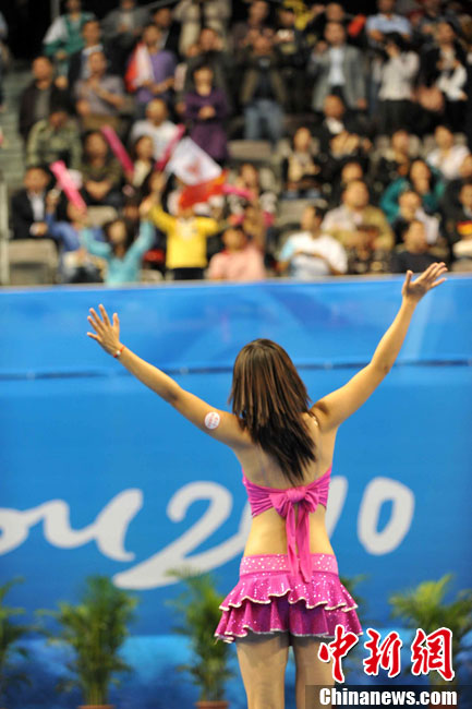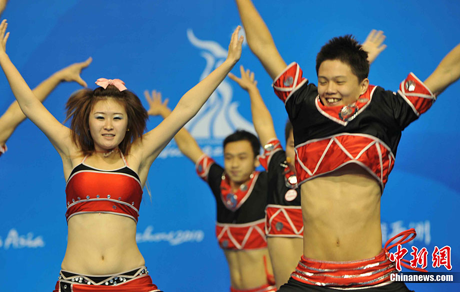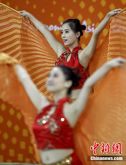 第十六屆廣州亞運(yùn)會(huì)各項(xiàng)比賽緊張激烈的進(jìn)行,比賽間隙的美女表演更吸引眼球。中新社記者 趙振清 攝