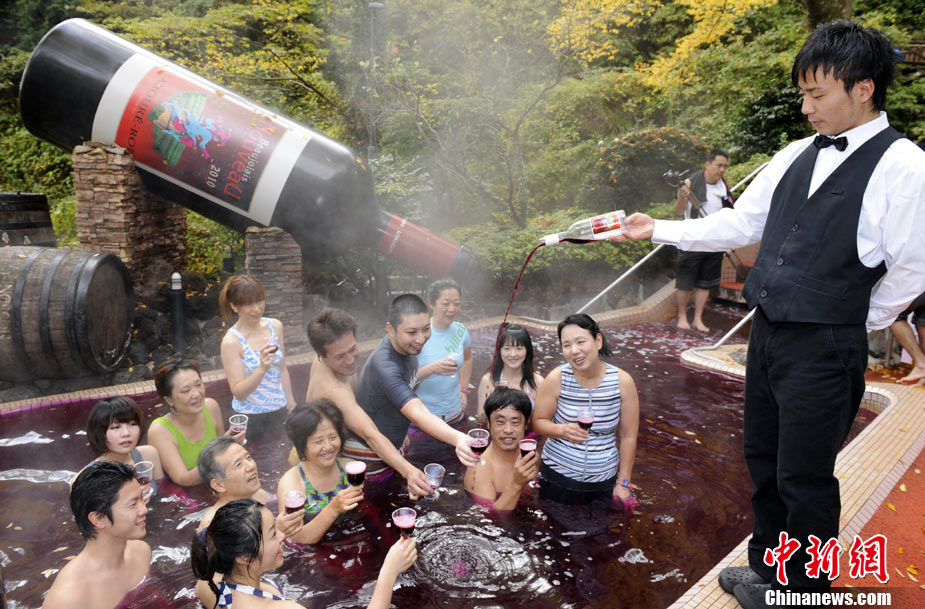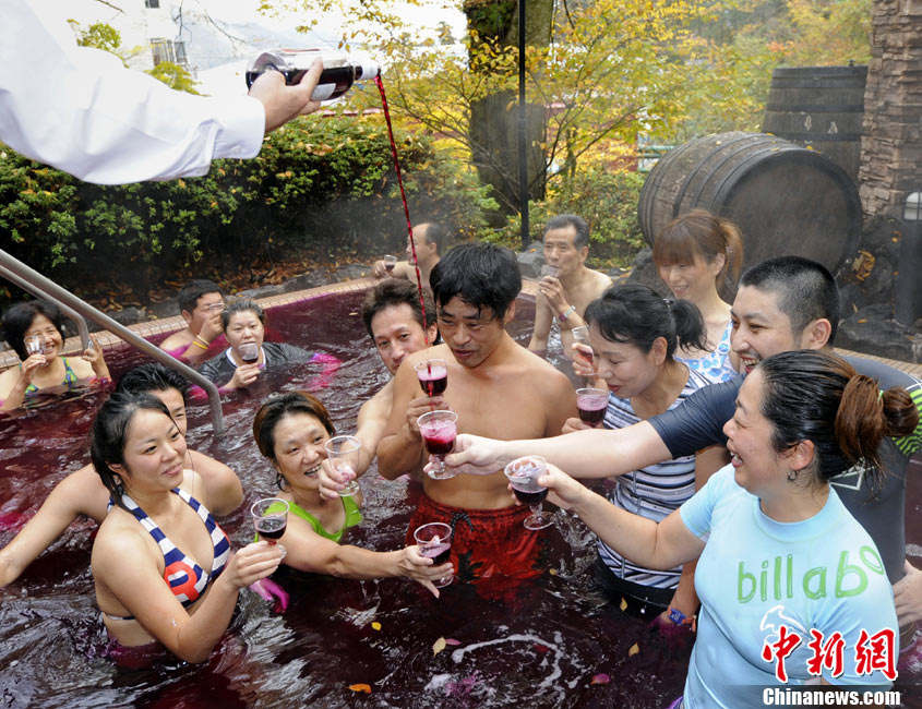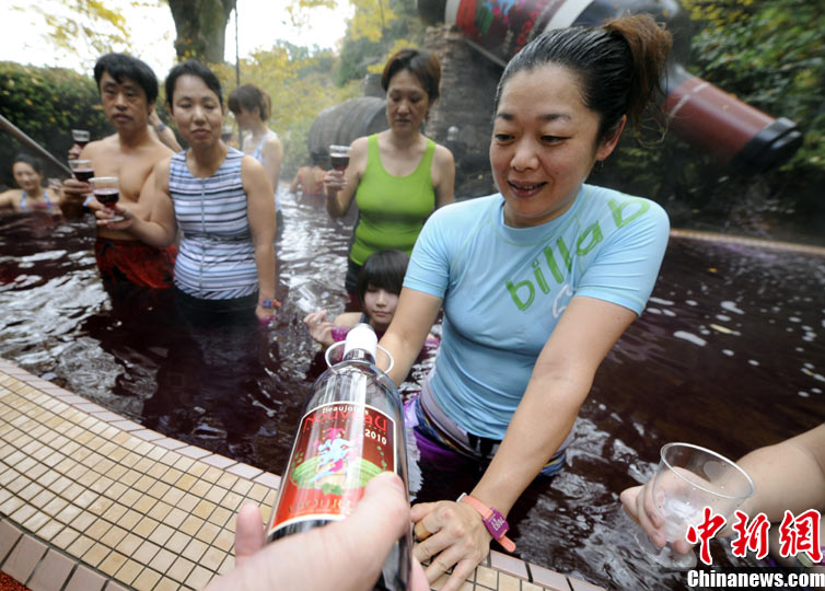 11月18日,一年一度的法國(guó)“博若萊”鮮葡萄酒開(kāi)瓶日到來(lái)。由于時(shí)差原因,日本飲者得以先嘗為快。在日本箱根的小涌園溫泉浴場(chǎng),客人們泡在鮮葡萄酒溫泉中舉杯慶祝。