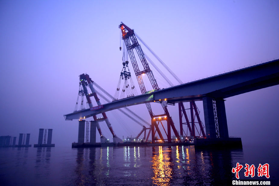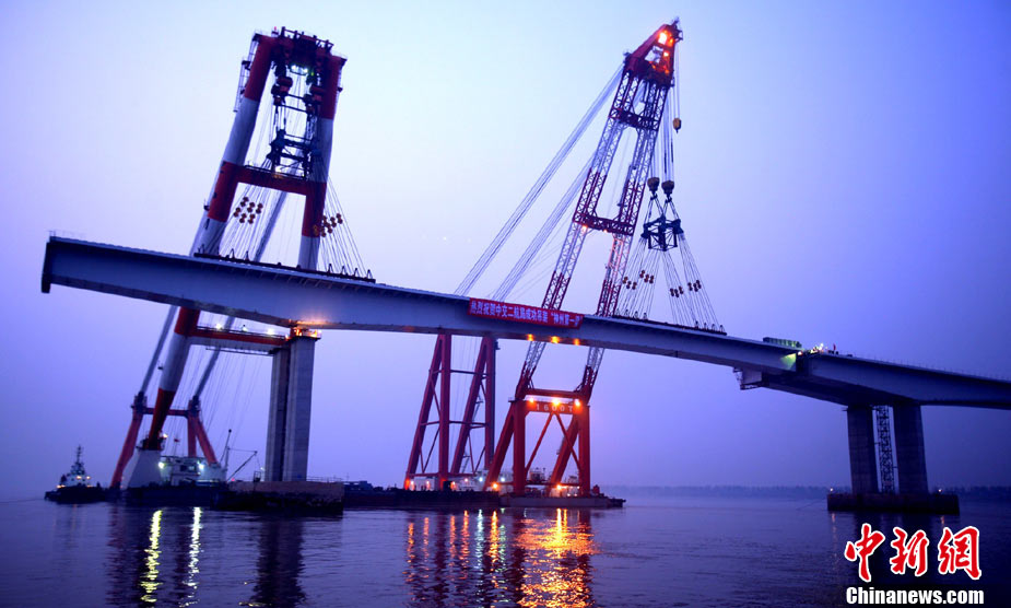 11月19日17時58分,堪稱“神州第一梁”的崇啟大橋首節(jié)185米鋼箱梁吊裝成功。崇啟大橋位于江蘇啟東和上海崇明島之間,長185米、寬16米的主橋變截面鋼箱梁精確吊放標志著崇啟大橋施工難度最大、技術最復雜、安全風險最高的吊裝工程取得關鍵性勝利,創(chuàng)造了國內(nèi)橋用鋼箱梁架設在單節(jié)起吊規(guī)模上的新記錄。 中新社發(fā) 崇啟橋指 供圖