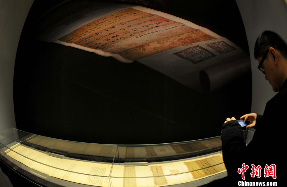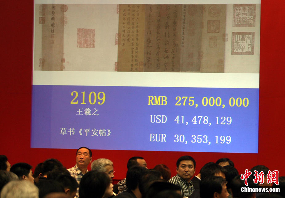 11月20日晚,在中國嘉德2010秋季拍賣會(huì)“秋光萬華——清代宮廷藝術(shù)集粹”專場中,王羲之草書《平安帖》以人民幣三億零八百萬成交。中新社記者 楊可佳 攝
