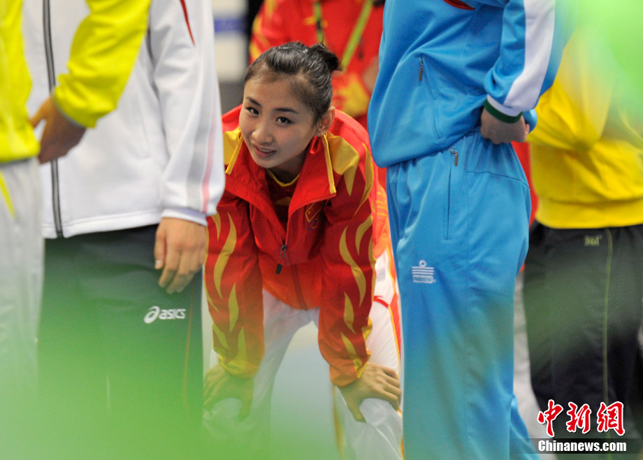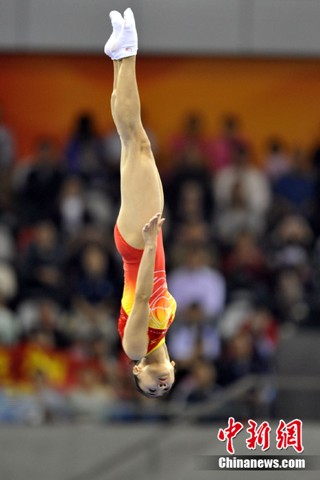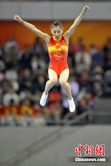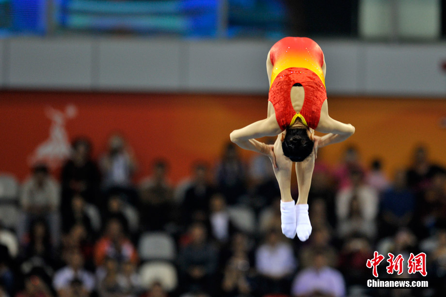 11月22日,廣州亞運會蹦床決賽在亞運城體育館舉行,“蹦床公主”何雯娜總分40.90獲得銀牌,隊友黃珊汕總分41.40摘得金牌。中新網(wǎng)記者 金碩 攝