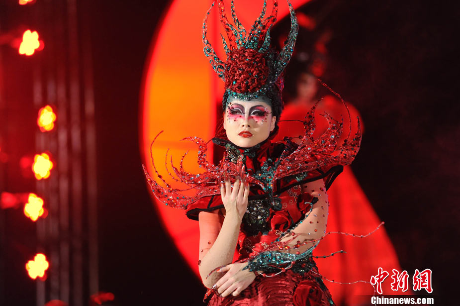 11月22日晚,第十屆中國國際美容美發(fā)化妝師全能大賽頒獎晚會在北京隆重舉辦。被業(yè)界譽為“中華美業(yè)第一賽”的全能大賽是中國一個超大規(guī)模的專業(yè)性賽事,當(dāng)天,容納6000多人的會場座無虛席。在400平米的專業(yè)舞臺上,來自日本、韓國、馬來西亞、新加坡及中國20多個省市自治區(qū)的40余支代表隊共400多名選手同臺競技,100多名專家評委現(xiàn)場評判。比賽過程精彩紛呈,亮點不斷,艷麗夸張的模特造型令觀眾大飽眼福。中新社記者 李學(xué)仕 攝