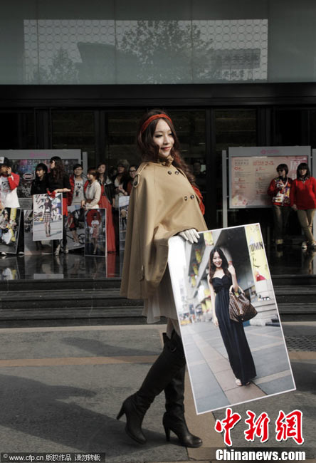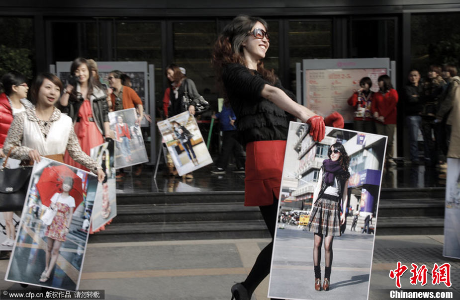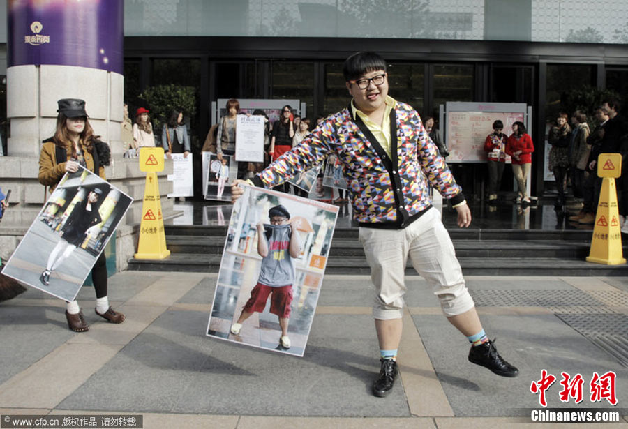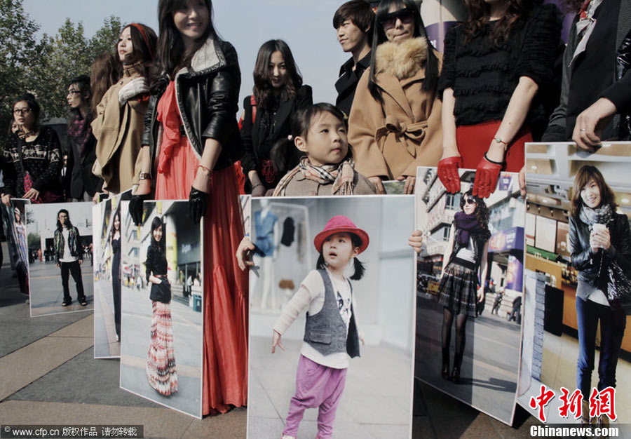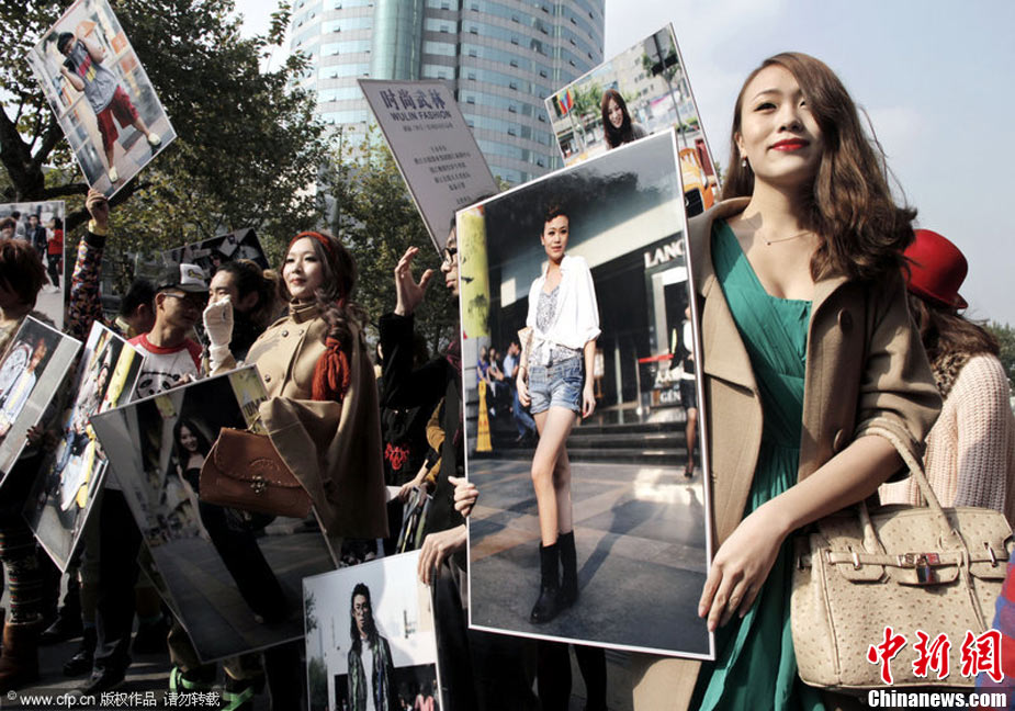 11月23日,在杭州廣場(chǎng)上,百余名身穿時(shí)尚服飾,化著個(gè)性?shī)y扮的年輕人,手拿自己的靚照,走上街頭,向人們大膽展示自己的風(fēng)采。右娃 攝 圖片來(lái)源:CFP視覺(jué)中國(guó)