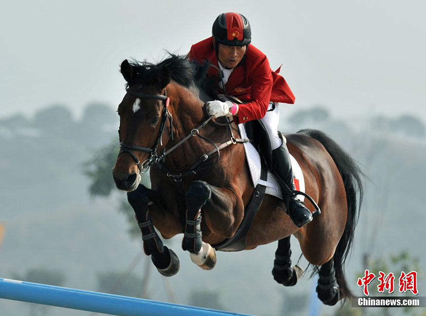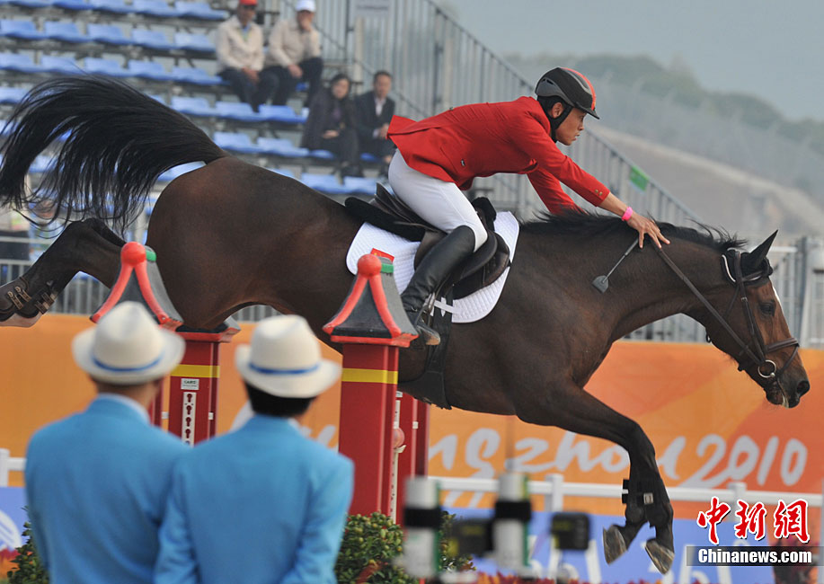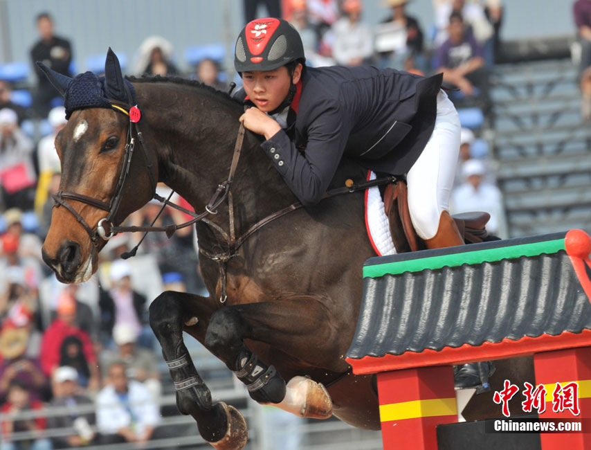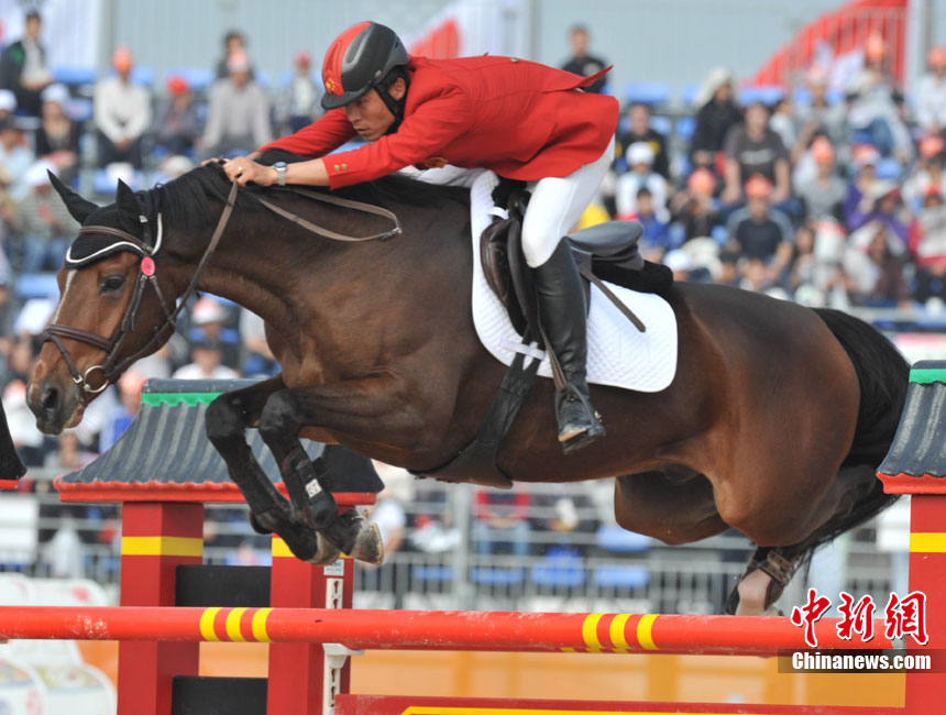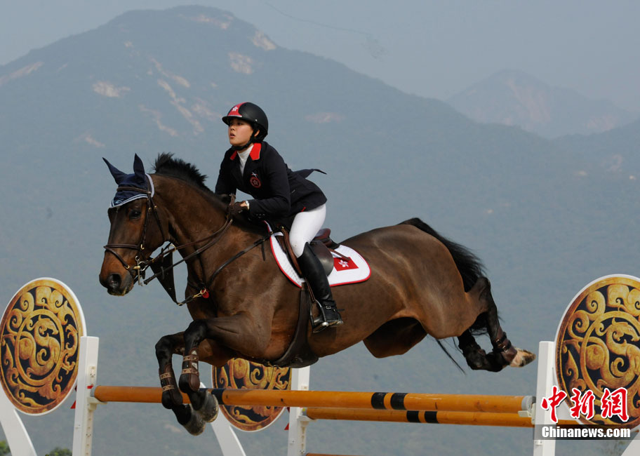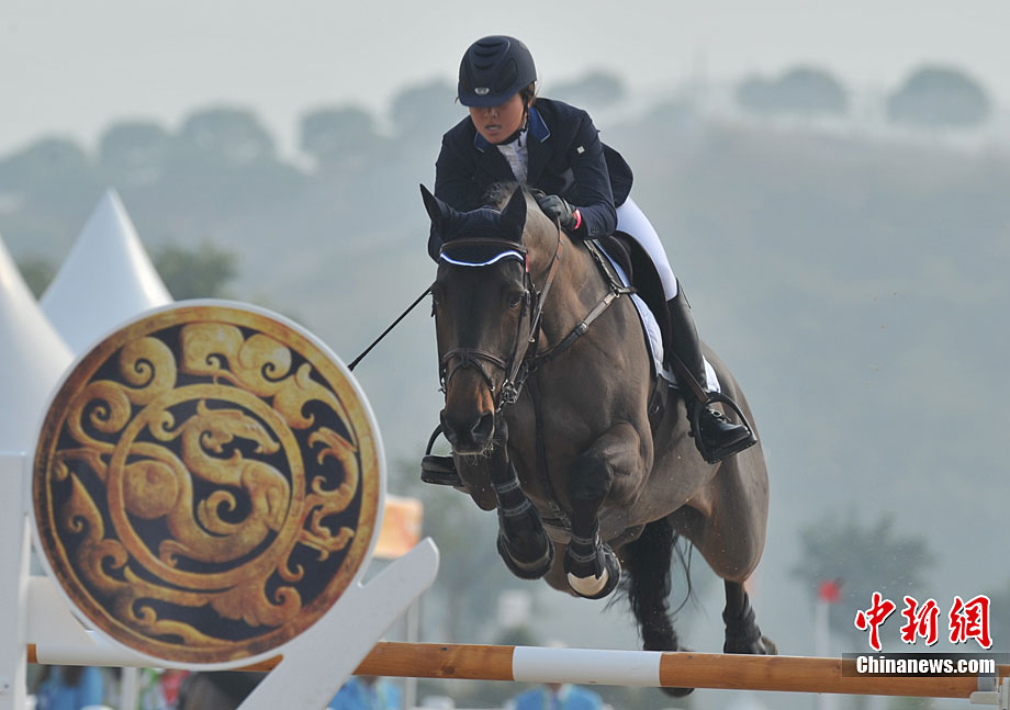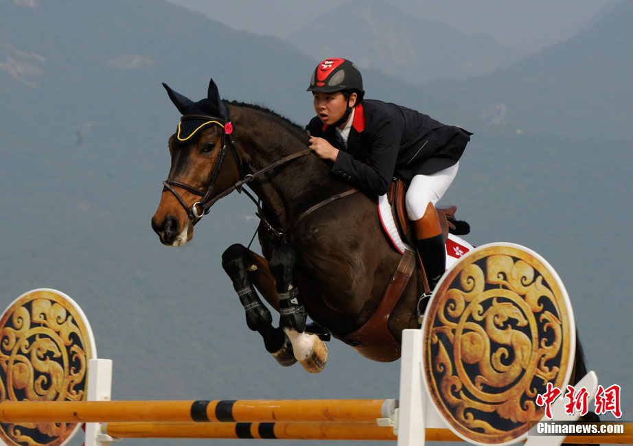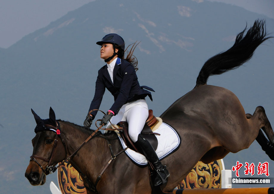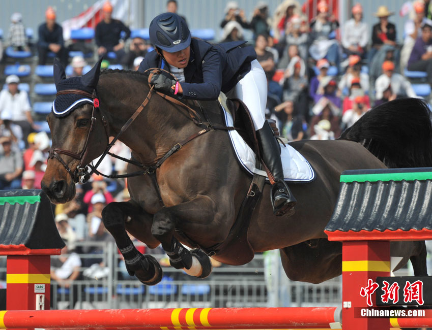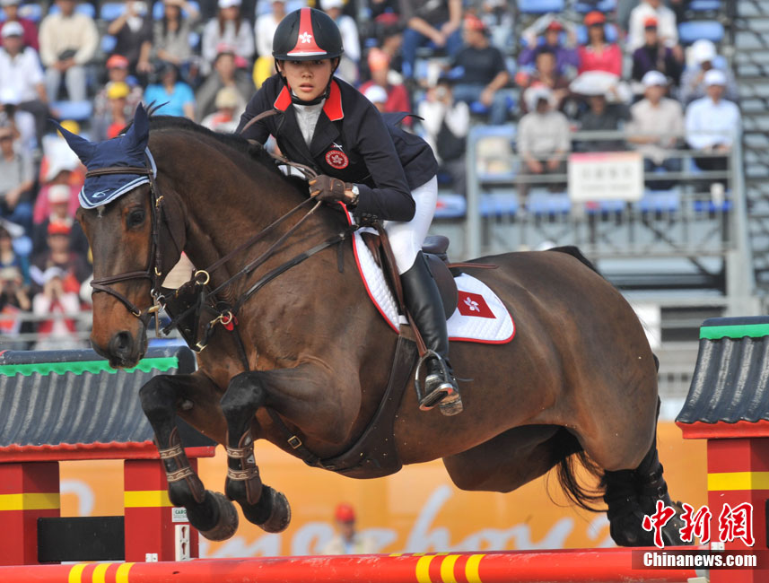 11月24日,日本女騎手武田麗子騎著愛駒,在廣州亞運會馬術(shù)個人場地障礙賽享受跨越木棉花圍欄的意境。中新社記者 賈國榮 攝