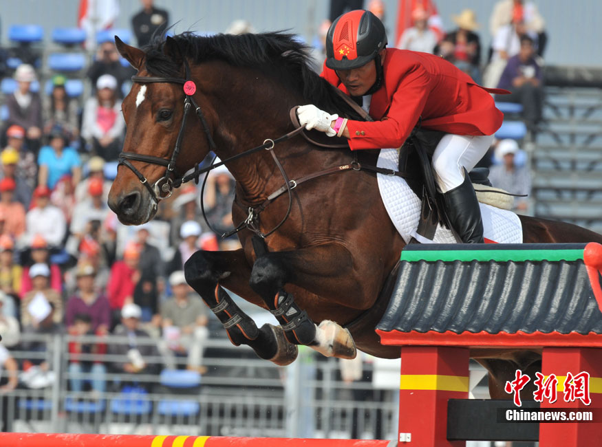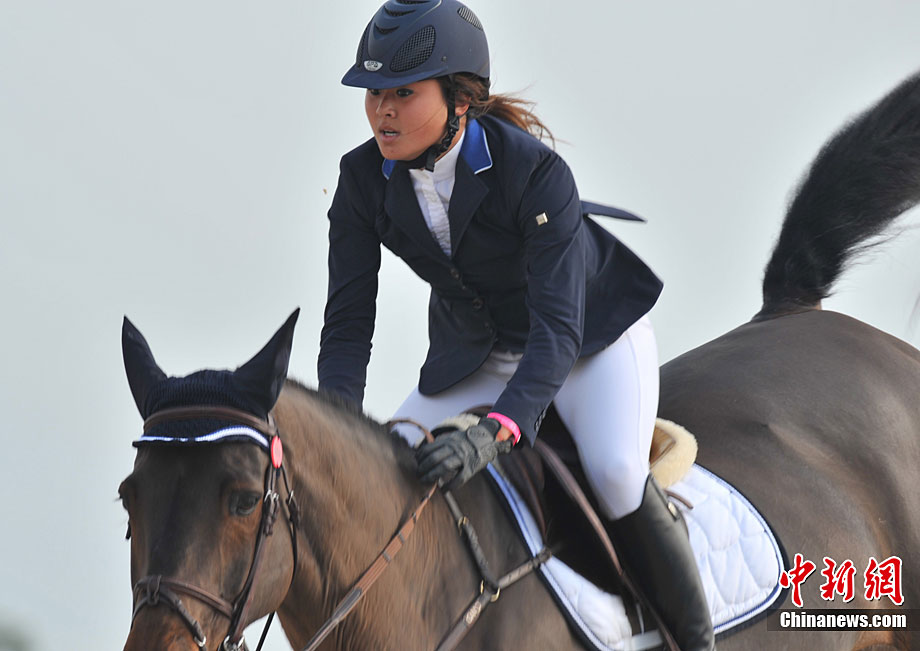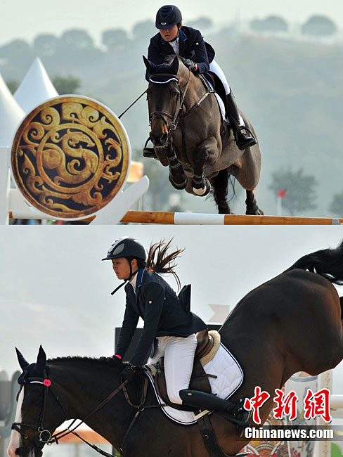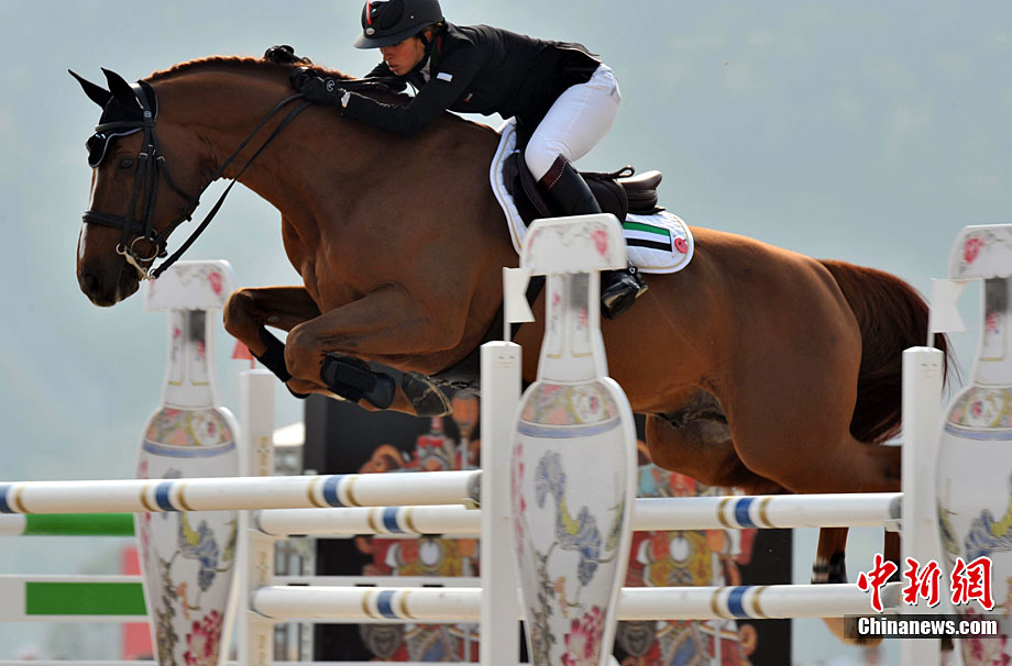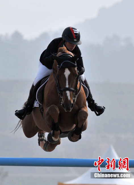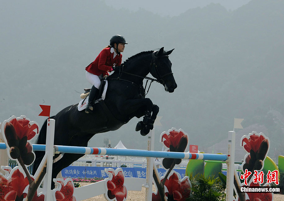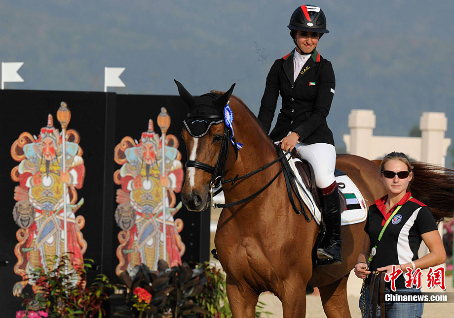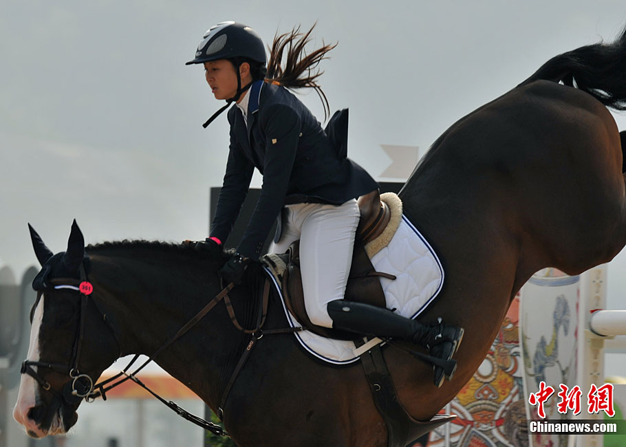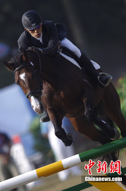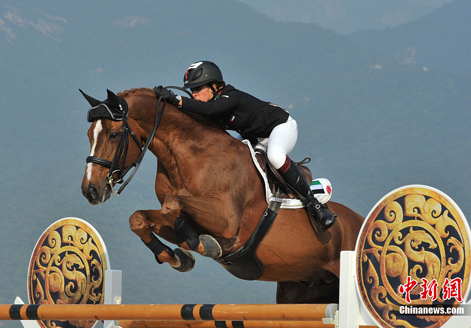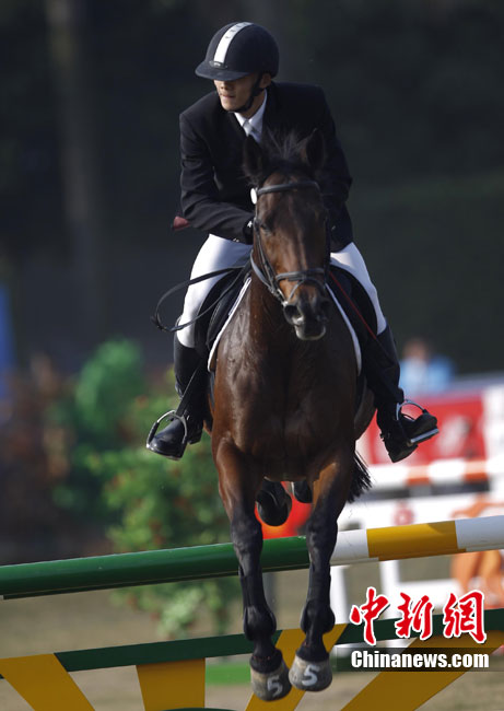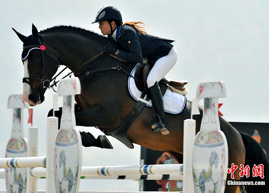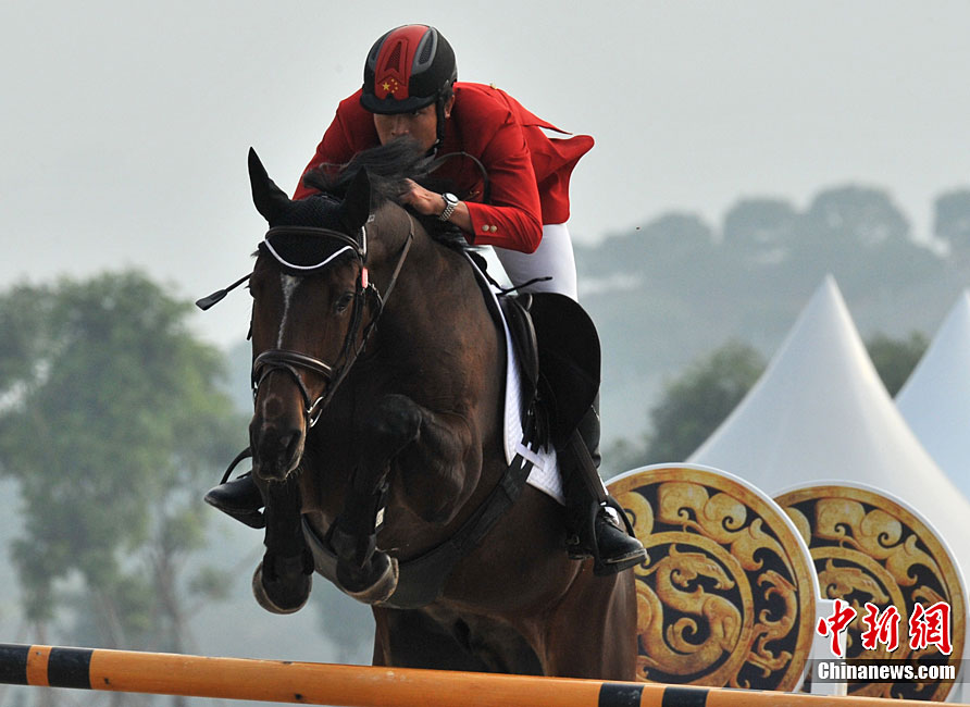 11月24日,日本女騎手武田麗子騎著愛駒,在廣州亞運會馬術(shù)個人場地障礙賽享受跨越木棉花圍欄的意境。中新社記者 賈國榮 攝