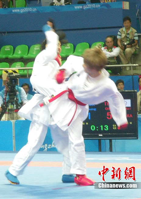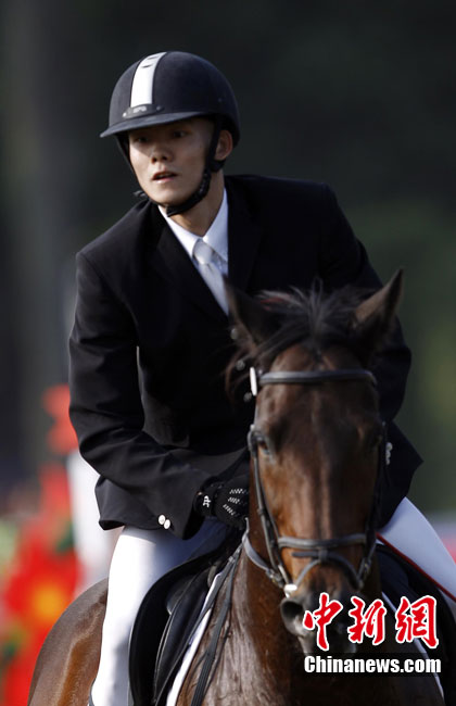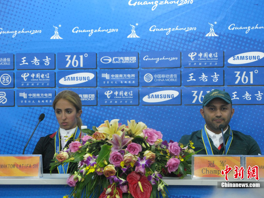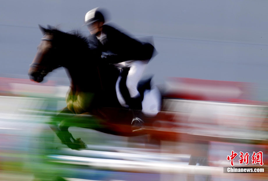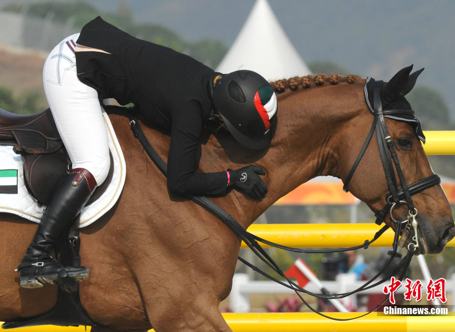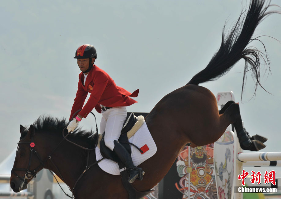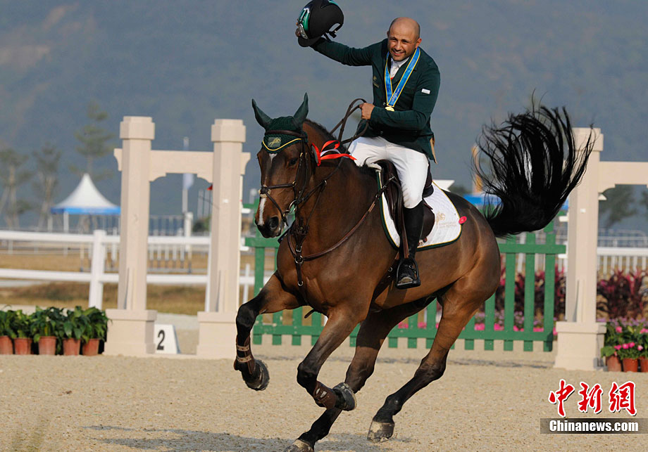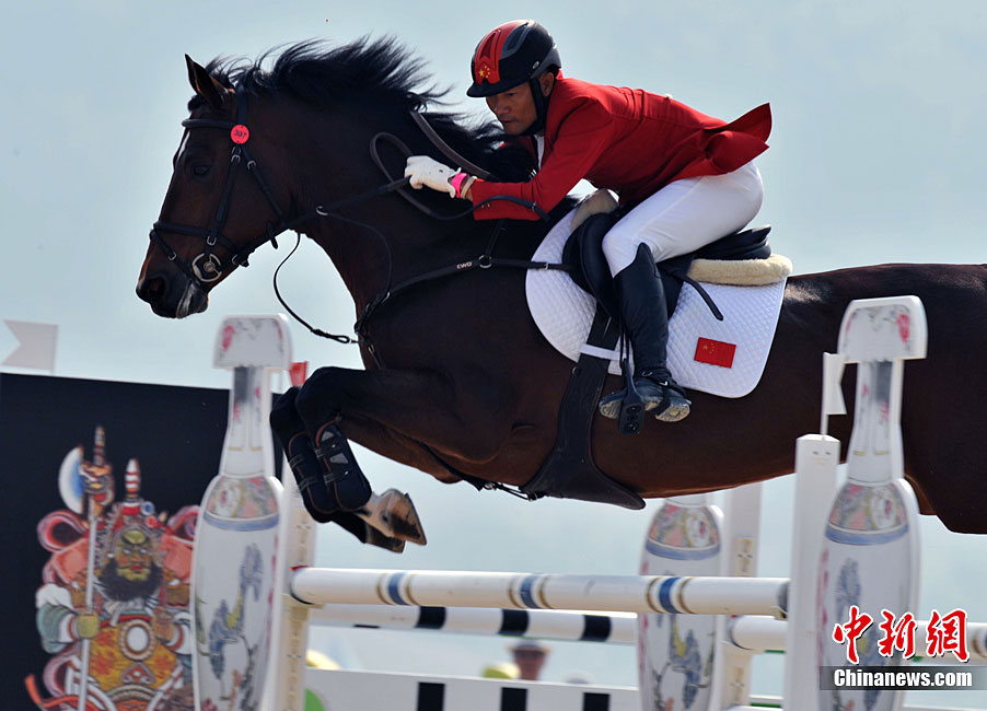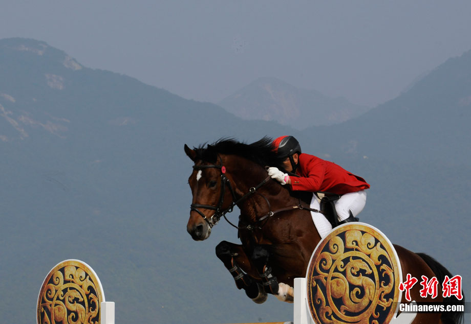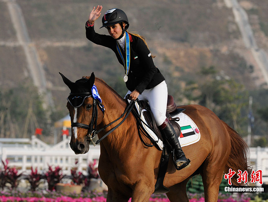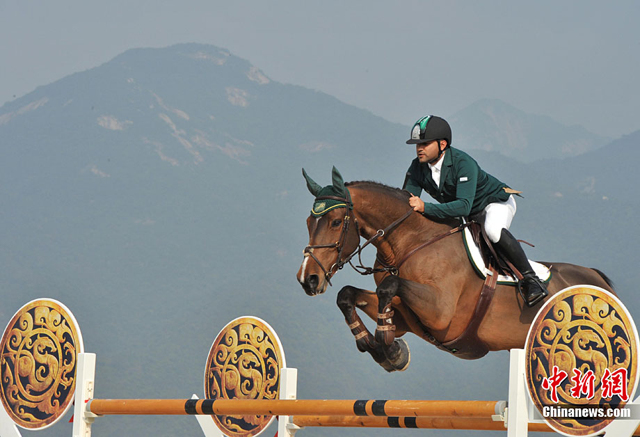 11月24日,日本女騎手武田麗子騎著愛駒,在廣州亞運會馬術(shù)個人場地障礙賽享受跨越木棉花圍欄的意境。中新社記者 賈國榮 攝