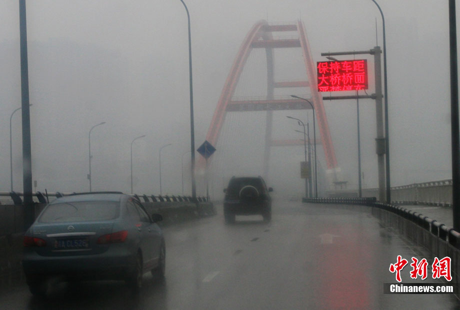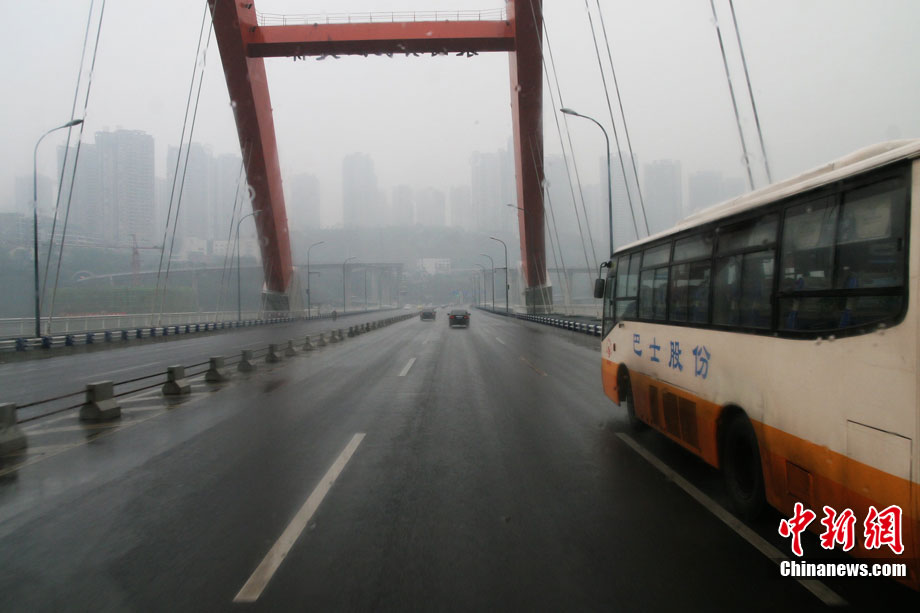 入冬以來,重慶連逢霧天。11月28日,一場雨霧再次來襲山城重慶。正午時分,雨霧仍未散去,重慶菜園壩長江大橋上視線仍不清晰。中新社記者 郭晉嘉 攝