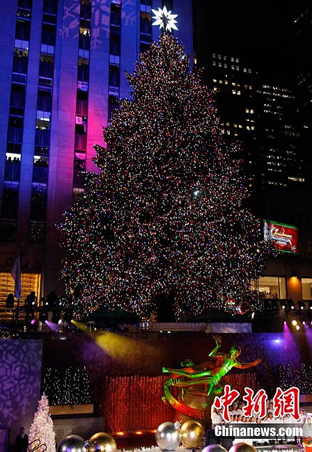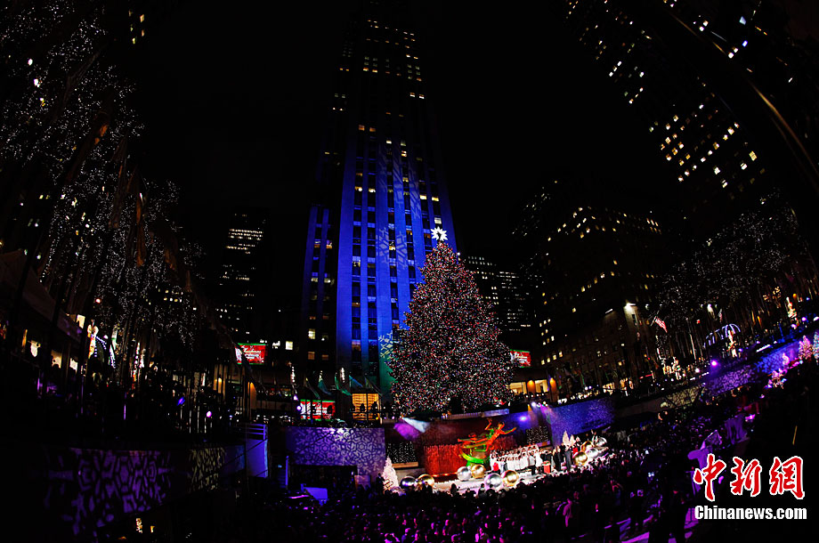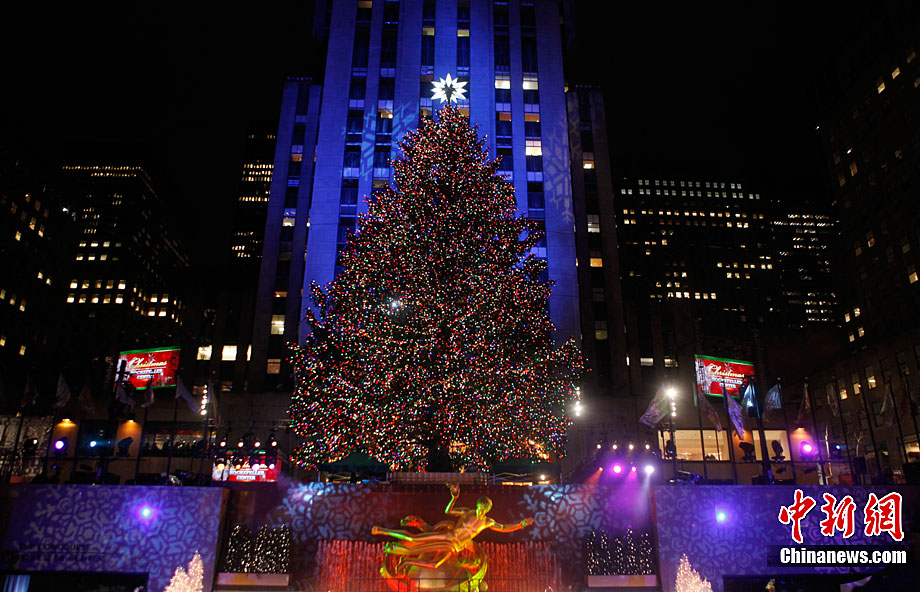 紐約洛克菲勒中心廣場(chǎng)圣誕樹正式點(diǎn)亮