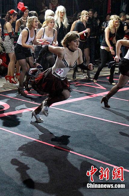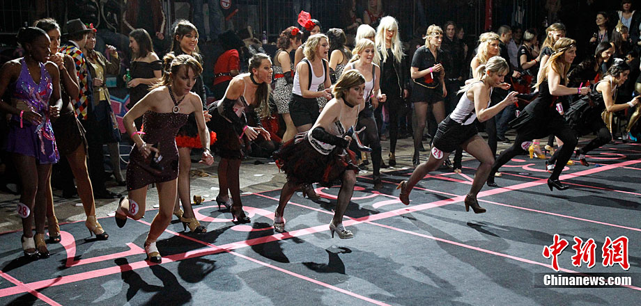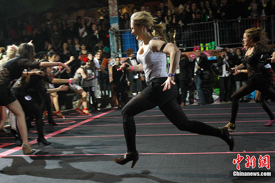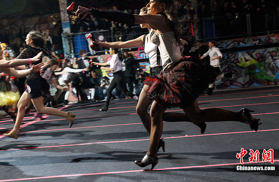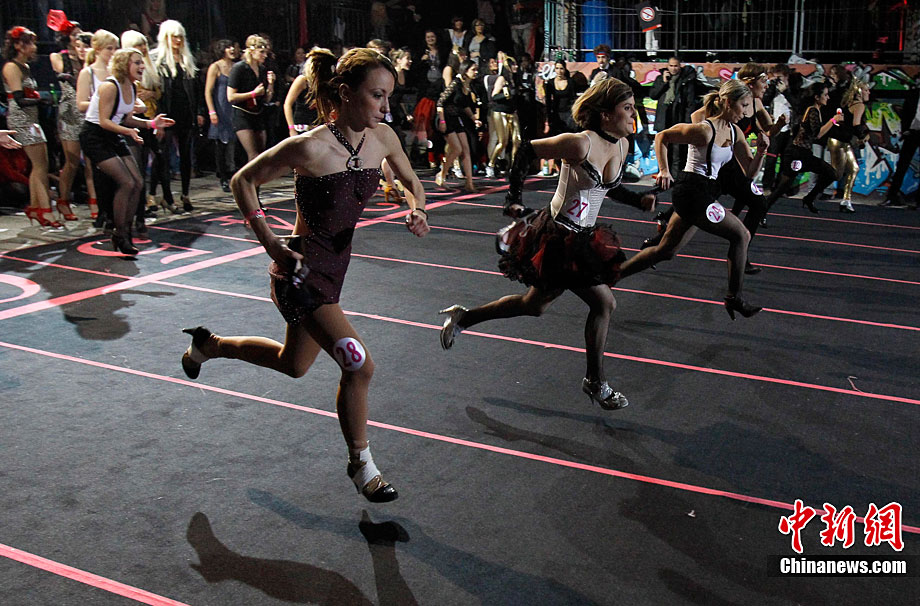 近日,第三屆Sarenza高跟鞋短跑比賽在法國巴黎舉行。來自法國和英國的選手參加了3×60米接力比賽。據(jù)悉,要想?yún)⒓舆@項(xiàng)趣味比賽,參賽者所穿的高跟鞋不得低于8厘米。