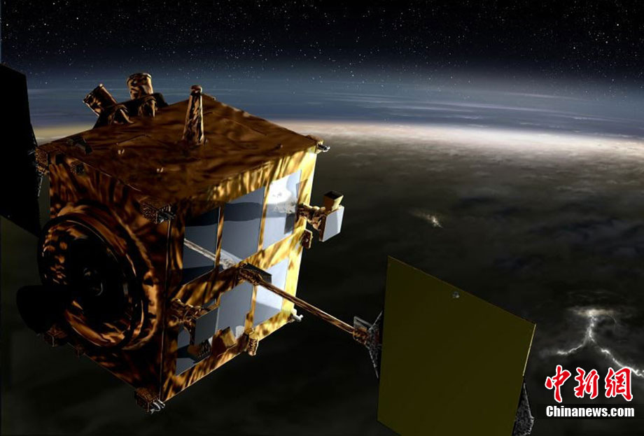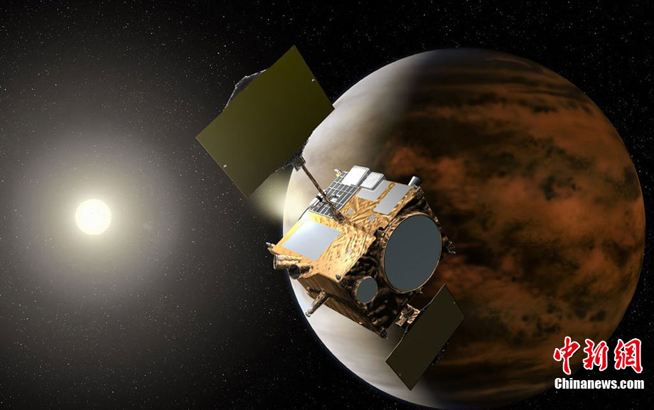2010年5月發(fā)射升空的日本金星探測(cè)器“拂曉”號(hào)于日本時(shí)間12月7日上午抵達(dá)距離金星最近處,并進(jìn)行為進(jìn)入環(huán)繞軌道的引擎反向噴射。圖為日本金星探測(cè)器“拂曉”號(hào)抵達(dá)金星上空的模擬圖。