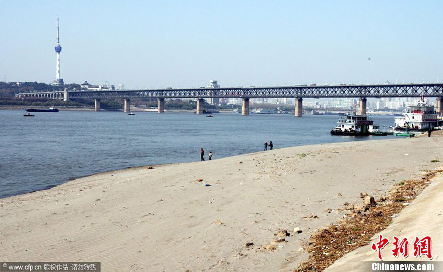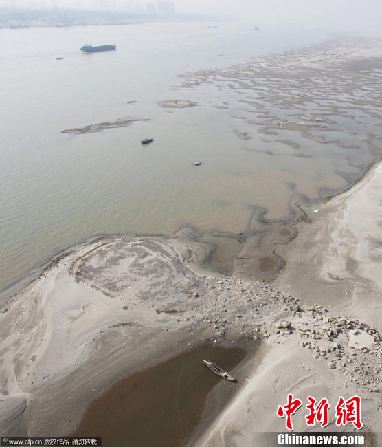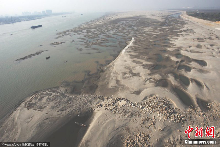 12月7日,在長江武漢市天興洲水域,大量沙洲露出江面,形成大大小小的沙丘,分布在水岸。據(jù)悉,近期,由于長江中下游地區(qū)持續(xù)多日的干燥少雨的天氣,長江漢口水位接近枯水期的標植。金思柳 攝 圖片來源:CFP視覺中國
