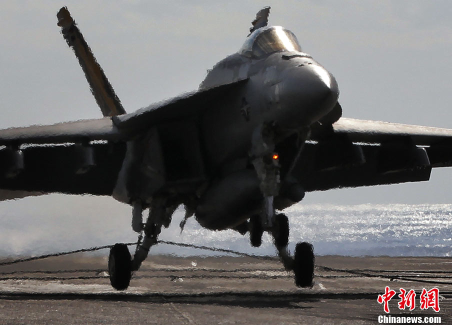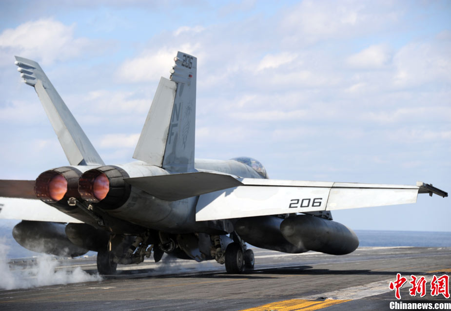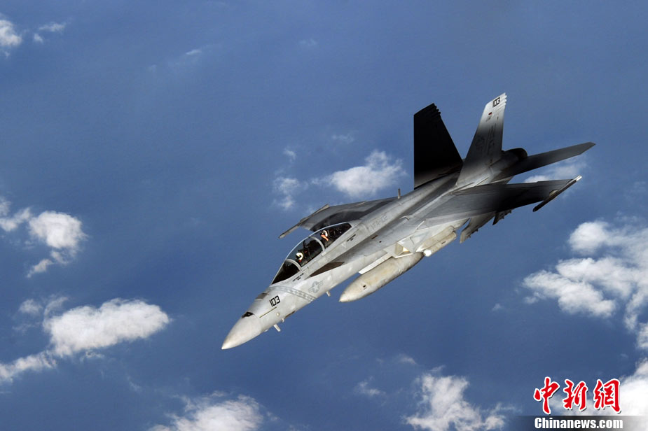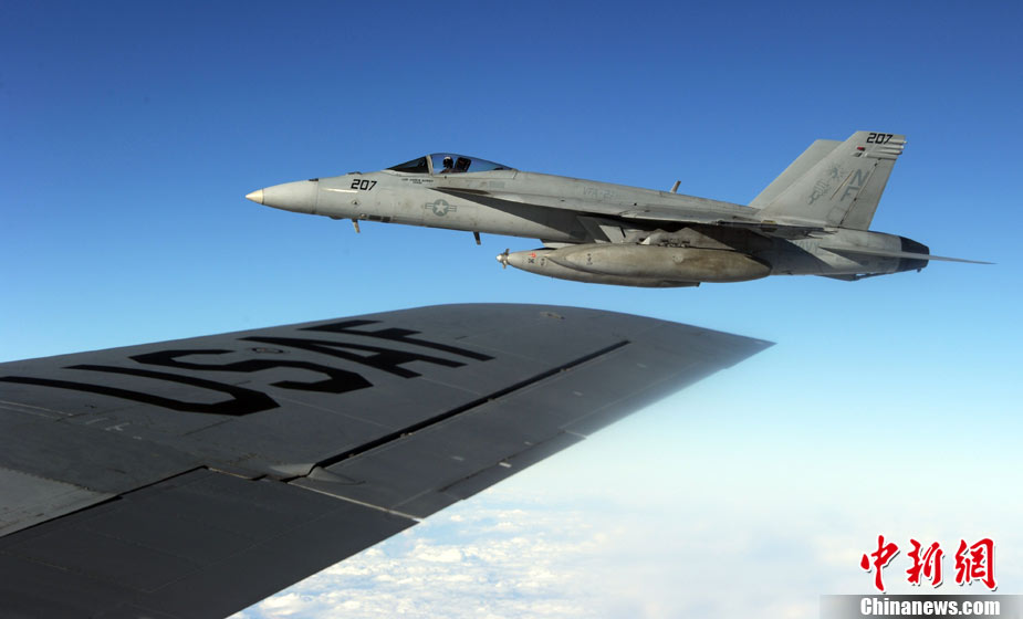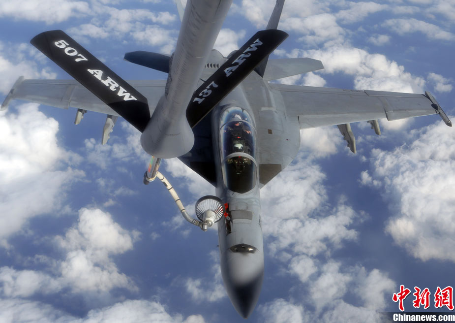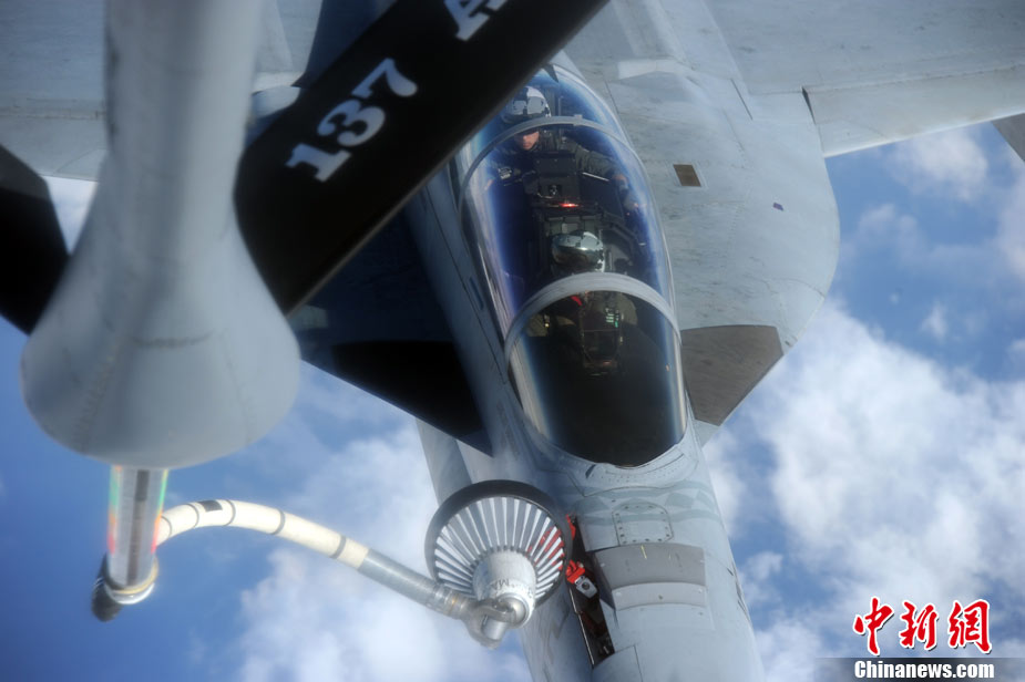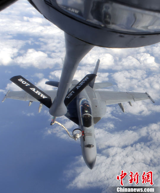 2010年12月9日,在日本南部海域舉行的代號“利劍”的美日聯(lián)合演習中,美軍一架FA-18 超級大黃蜂戰(zhàn)機在空中加油。