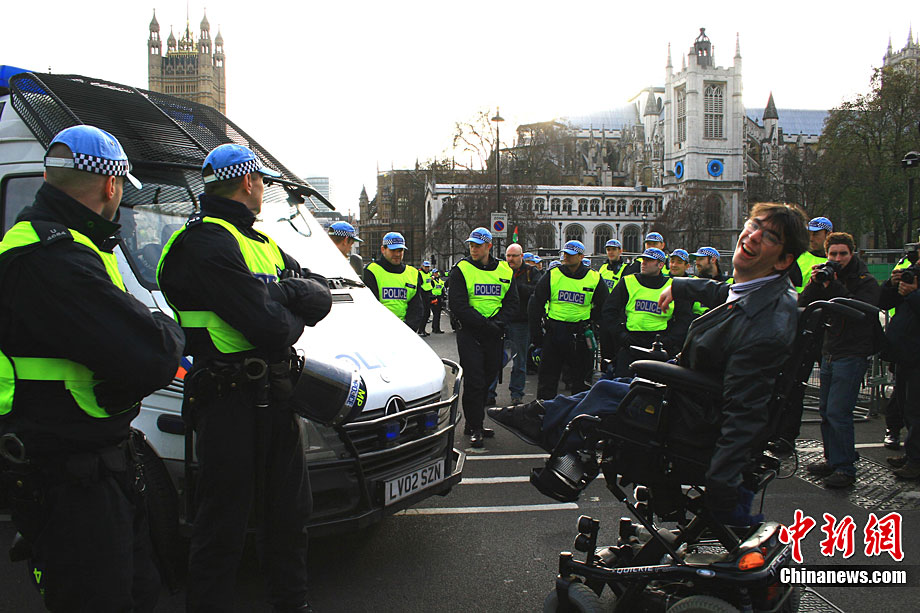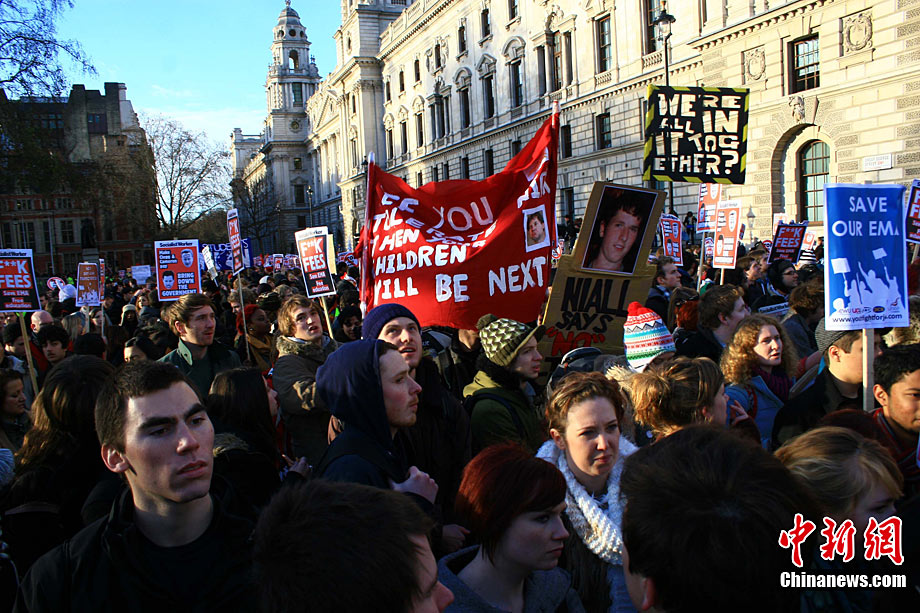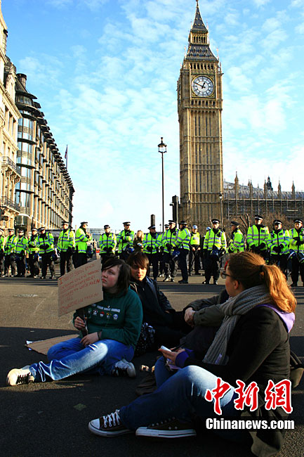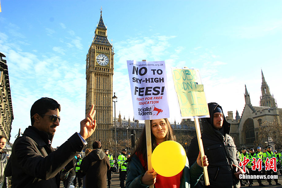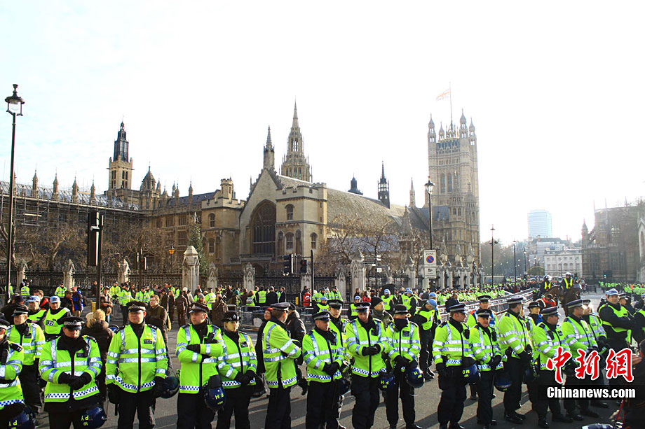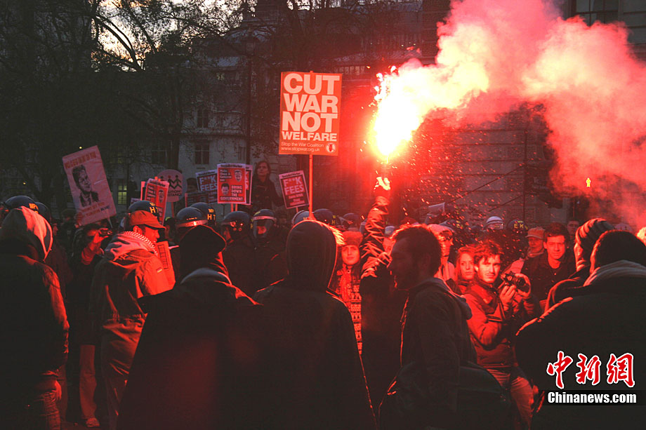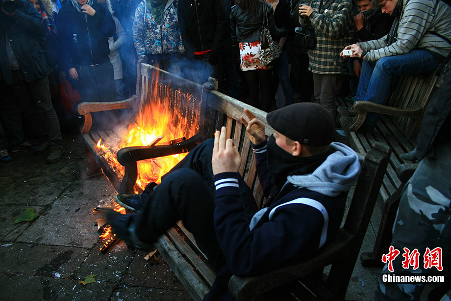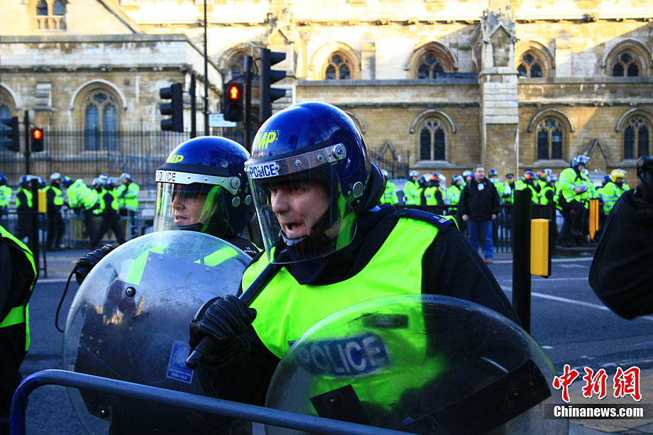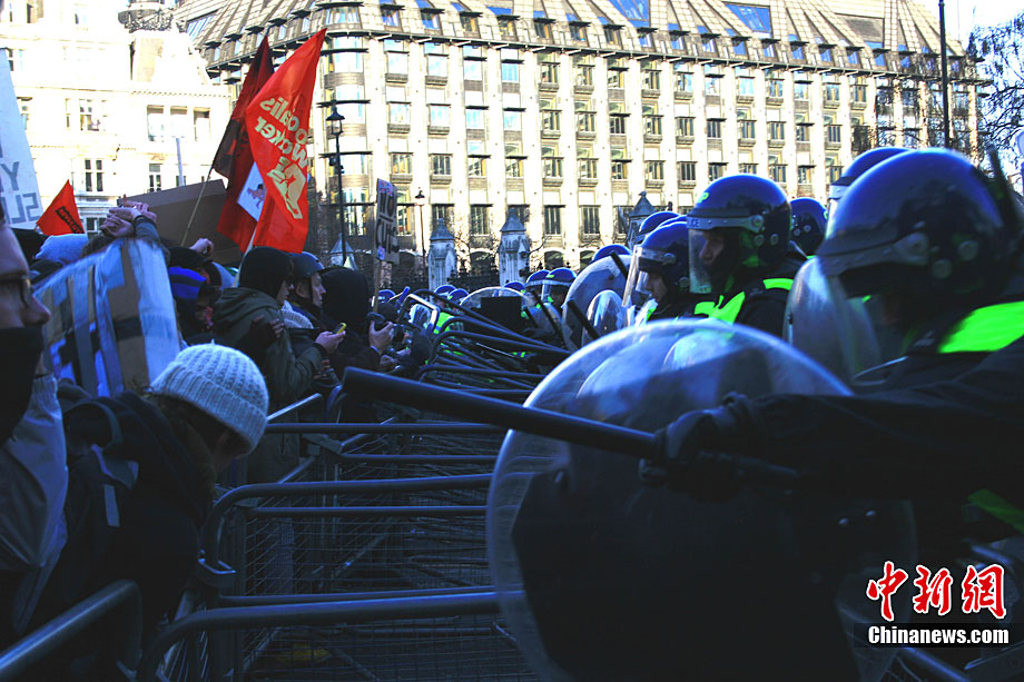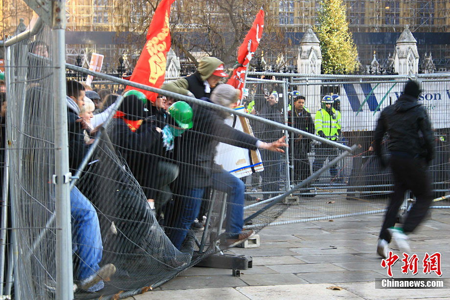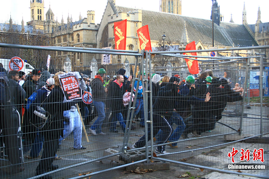 當(dāng)?shù)貢r(shí)間12月9日,為抗議議會(huì)表決通過(guò)政府有關(guān)大學(xué)學(xué)費(fèi)上漲提案,倫敦爆發(fā)大規(guī)模學(xué)生抗議示威,引發(fā)示威者與警方?jīng)_突,37人受傷,15人被捕。圖為示威者沖破議會(huì)大廈前廣場(chǎng)施工柵欄。中新社記者 魏群 攝