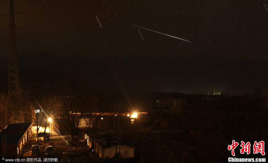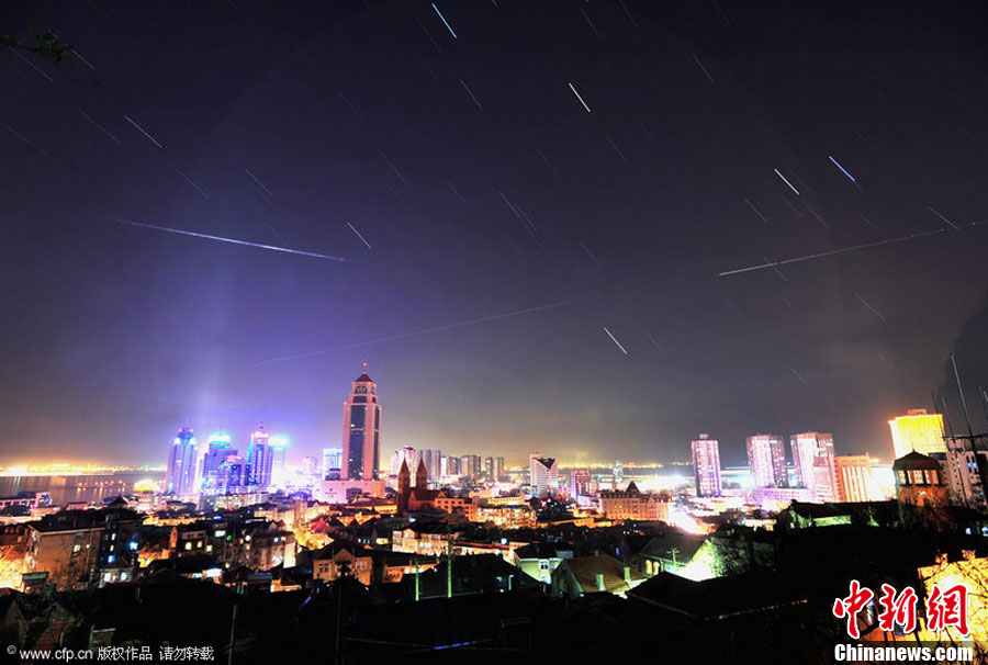 臨近歲末,雙子座流星雨如期而至。12月14日19時,雙子座流星雨達到極大,每小時流星量達120顆。圖為山東青島棧橋景區(qū)上空明亮的流星從雙子星座輻射而出,劃過城市上空。周昆 攝 圖片來源:CFP視覺中國