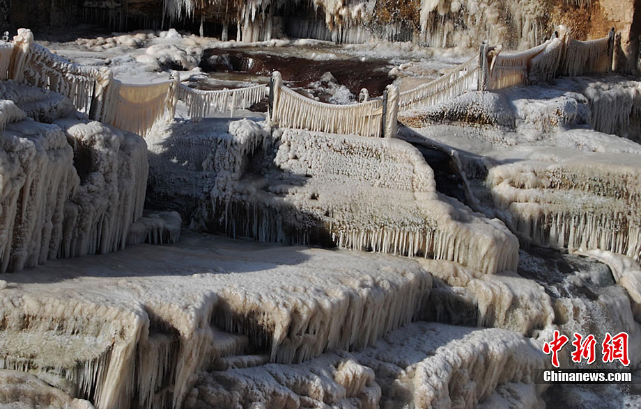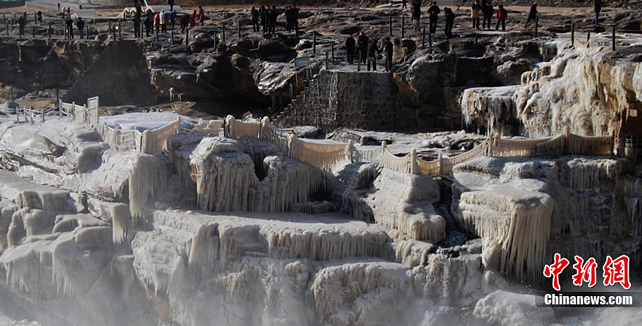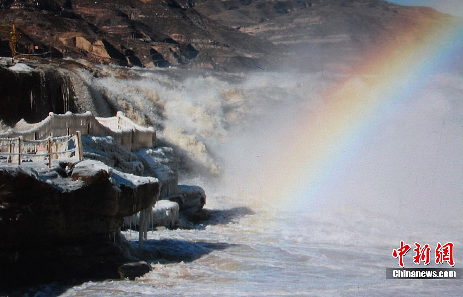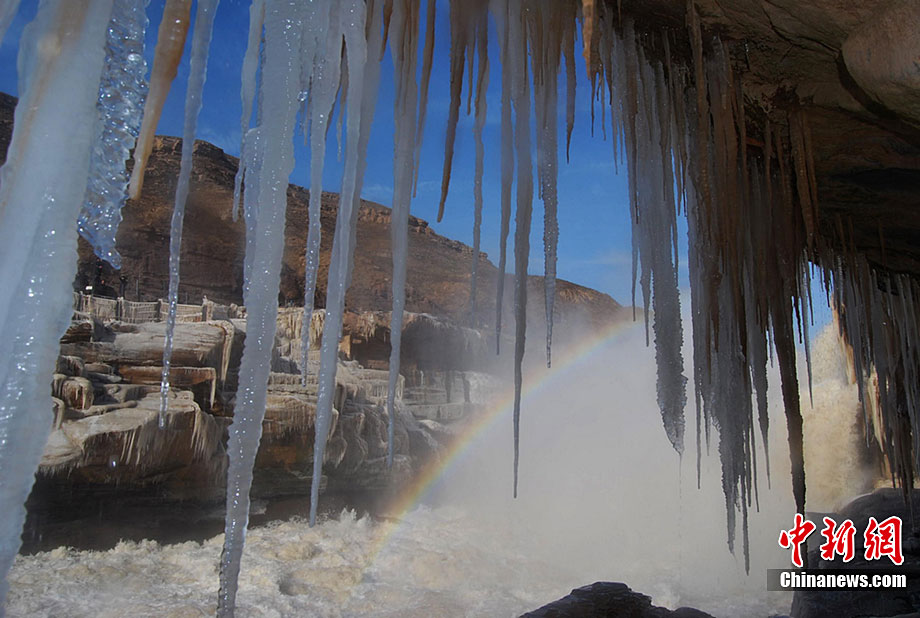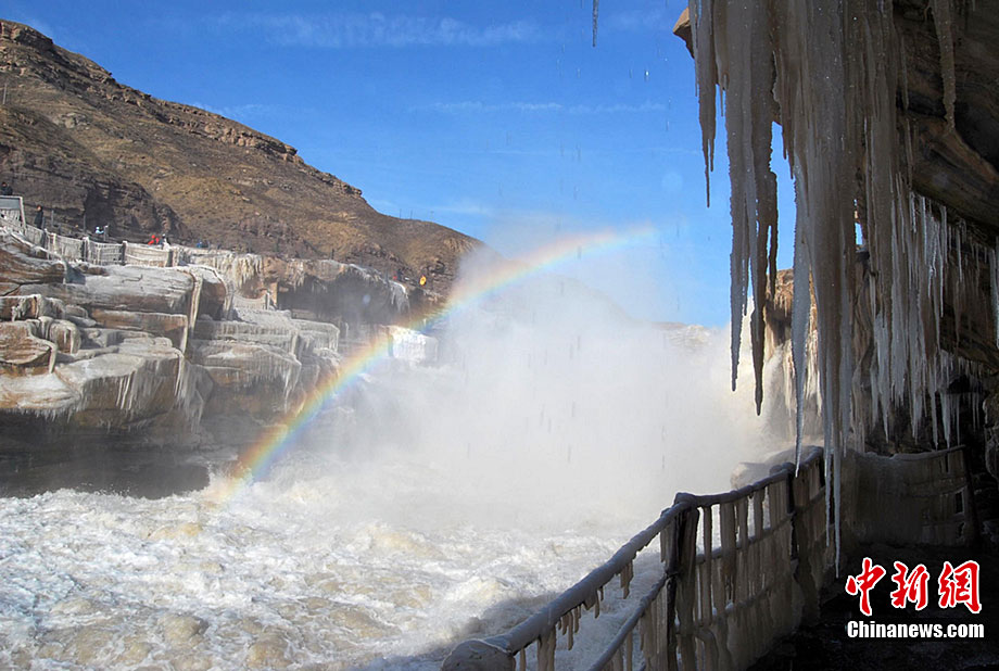 12月15日,受大風(fēng)降溫天氣的影響,黃河壺口段開(kāi)始大面積流凌。壺口瀑布兩岸的巖石和護(hù)欄上也開(kāi)始凝結(jié)一排排美麗壯觀的冰掛,晶瑩剔透,造型各異,與瀑布中飛舞的彩虹交相輝映,為冬日的壺口瀑布平添了幾分秀色,讓許多游客流連忘返,頻頻舉起手中的相機(jī)拍照留念。呂桂明 攝 圖片來(lái)源:CNSPHOTO