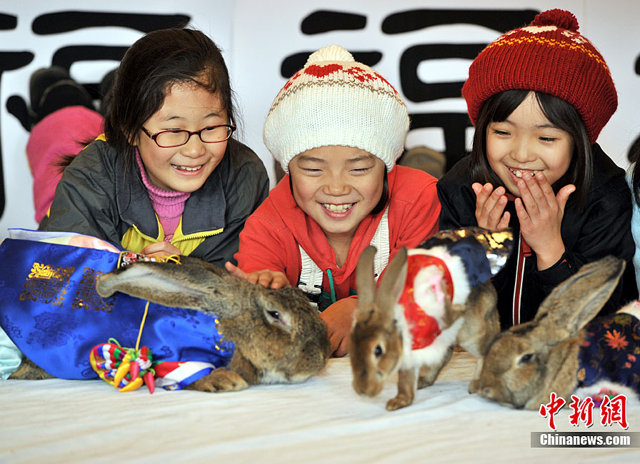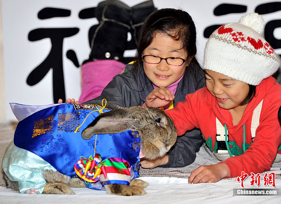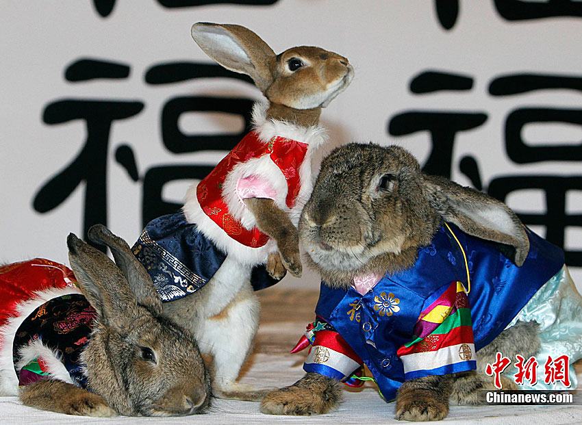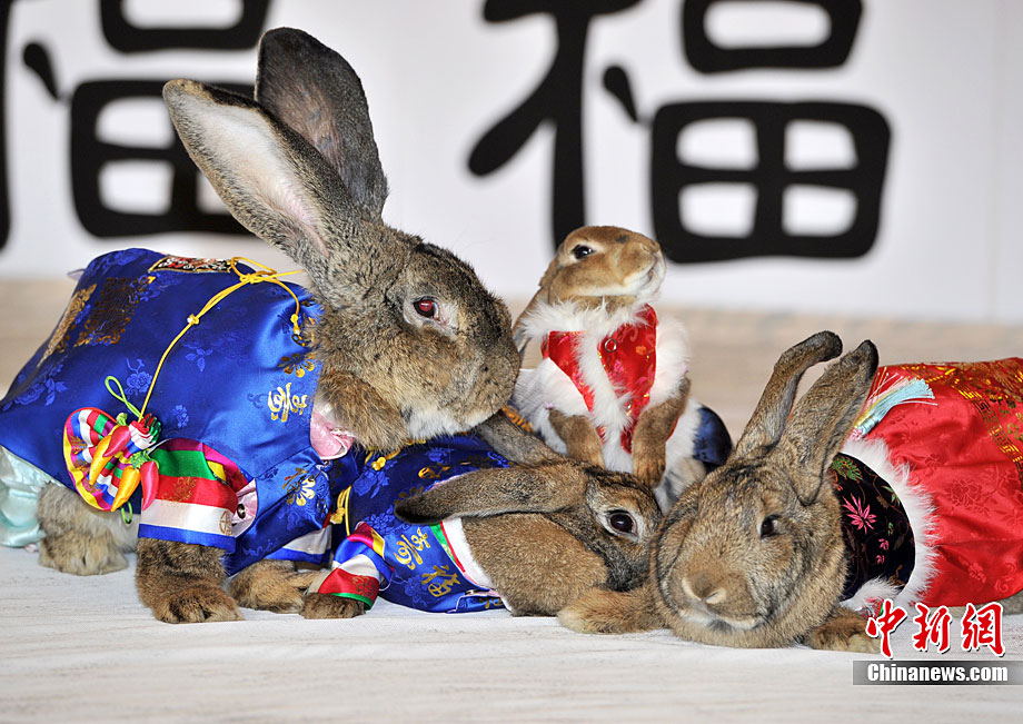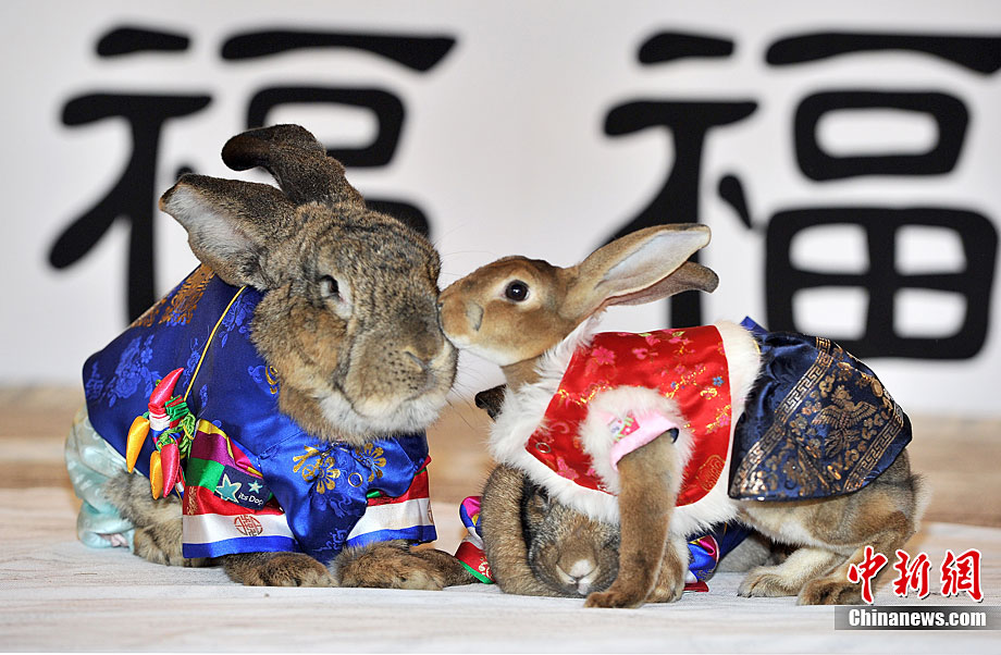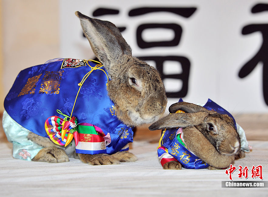 當?shù)貢r間12月16日,位于韓國京畿道龍仁市的愛寶樂園展出數(shù)只穿著傳統(tǒng)民族服飾“韓服”的兔子,迎接即將到來的兔年。