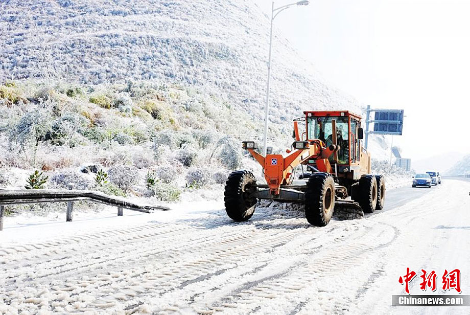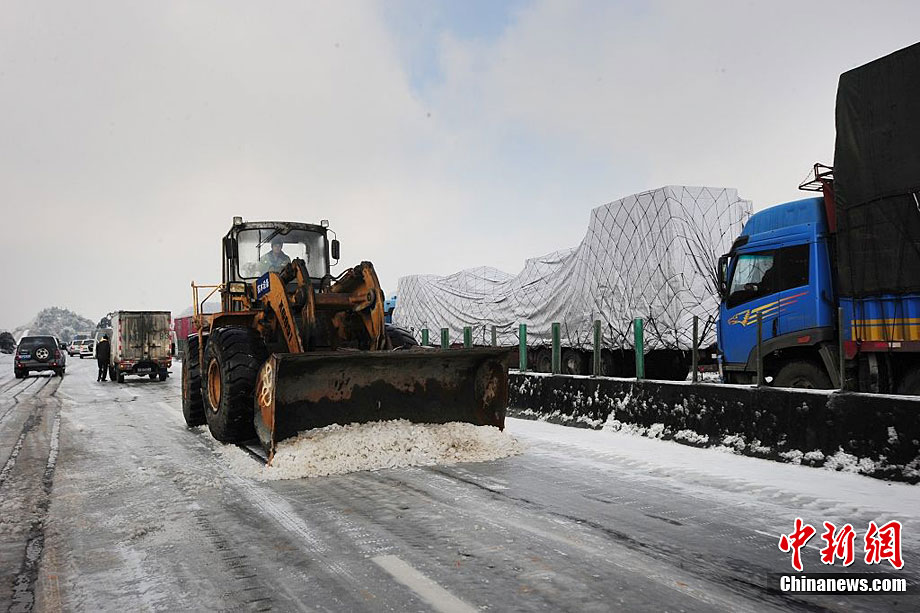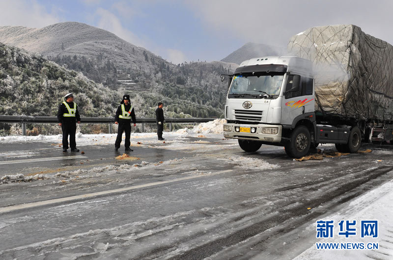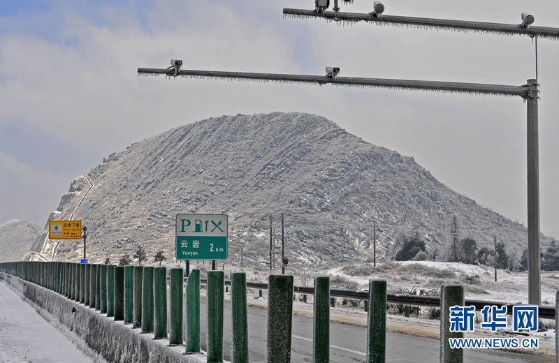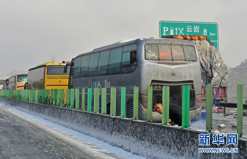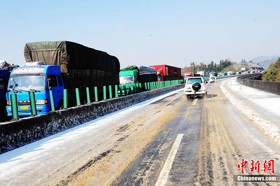 受強(qiáng)冷空氣南下影響,廣東北部山區(qū)氣溫降至零下,境內(nèi)的京港澳高速乳源段和坪乳公路路面結(jié)冰,交通從12月16日凌晨開始中斷,大量車輛滯留。經(jīng)全力抗冰搶險(xiǎn),相關(guān)路段于16日14時(shí)許恢復(fù)正常通行。17日,已搶通的京港澳高速公路粵北段路面再次結(jié)冰,車輛滯留10公里。李凌 攝