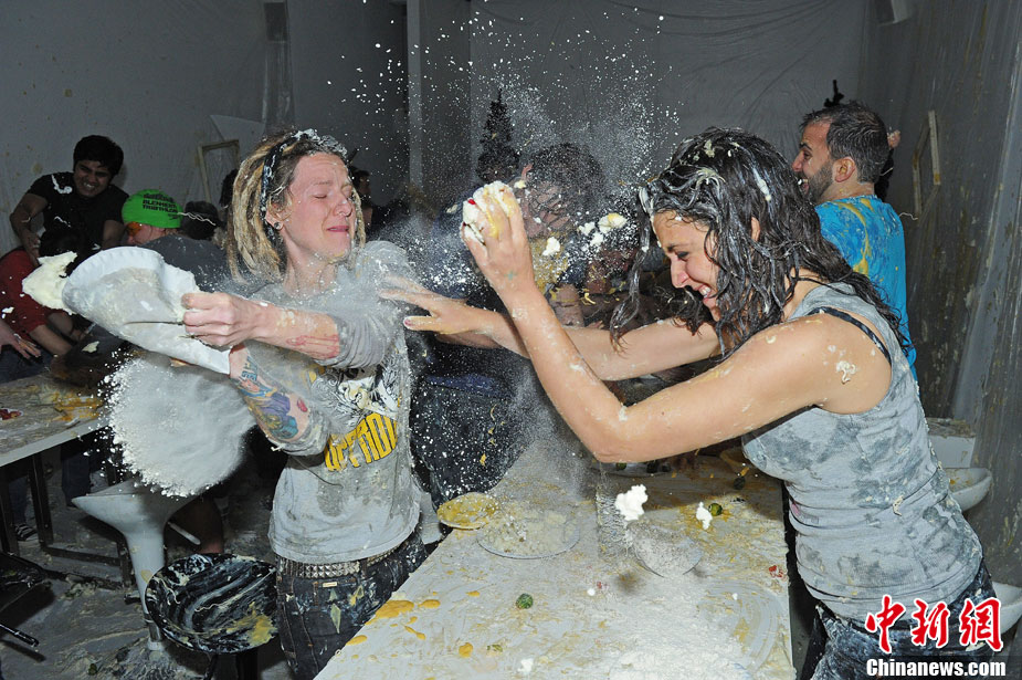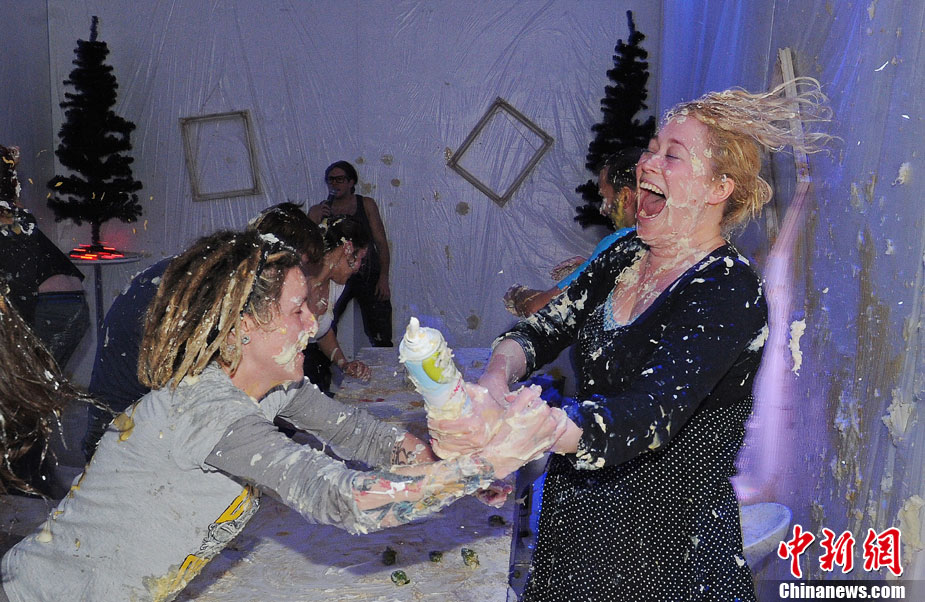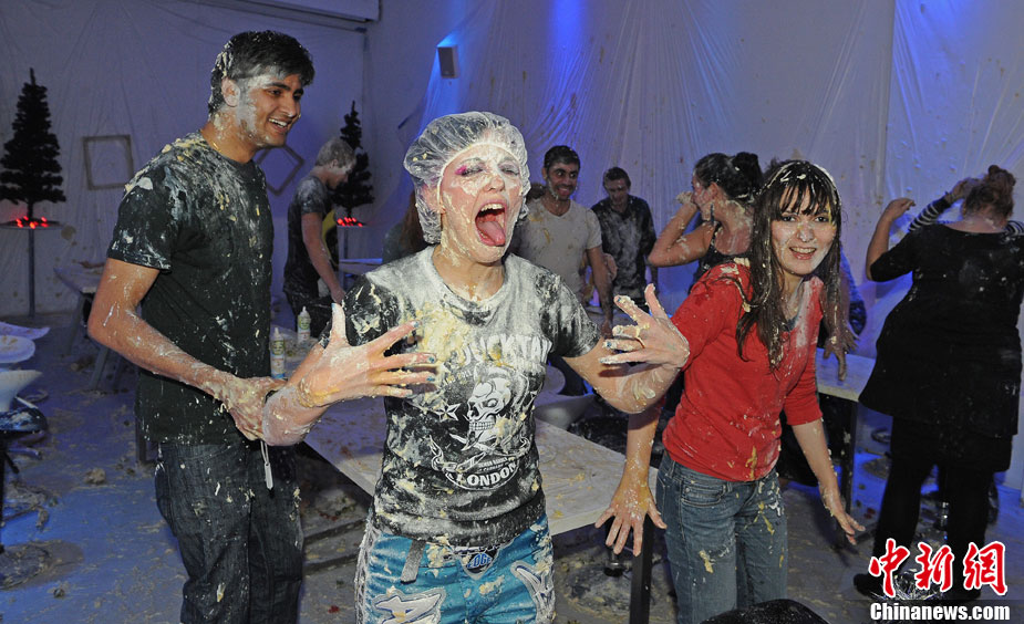 2010年12月18日,人們在英國倫敦一家畫廊中參加圣誕食物大戰(zhàn)活動。在活動中人們用甘藍、土豆泥、果凍及奶油等食品互相“攻擊”,此活動的門票收入將捐獻給慈善機構(gòu)。