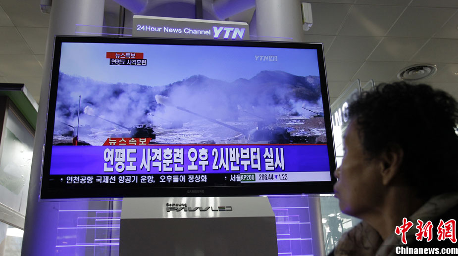 12月20日,韓國(guó)軍方開始在延坪島舉行海上實(shí)彈射擊訓(xùn)練。圖為韓國(guó)民眾在電視上收看演習(xí)訓(xùn)練的新聞。