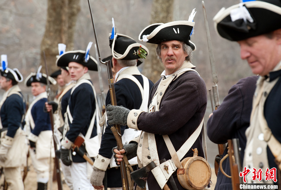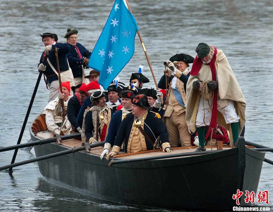 12月25日圣誕節(jié),在美國賓夕法尼亞州華盛頓橫渡歷史公園,身著美國獨立戰(zhàn)爭期間大陸軍軍裝的“士兵們”在“喬治·華盛頓”(右二)的引領(lǐng)下乘船渡過特拉華河。