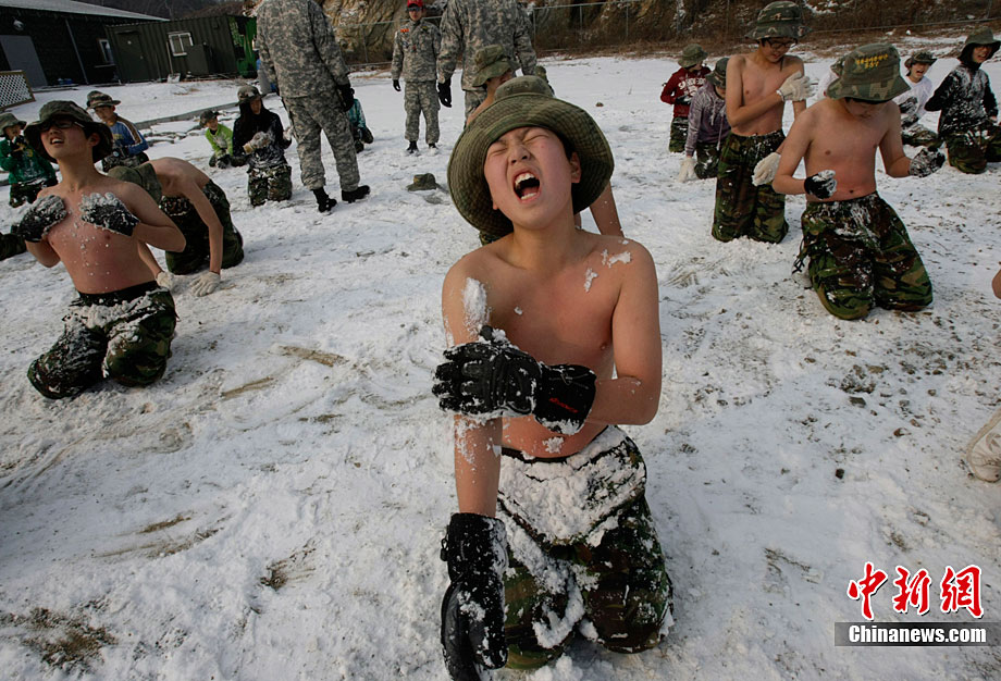 12月27日,韓國安山島Daebu的新兵訓(xùn)練營內(nèi),部分韓國中小學(xué)生赤膊在雪地中進(jìn)行軍事訓(xùn)練。