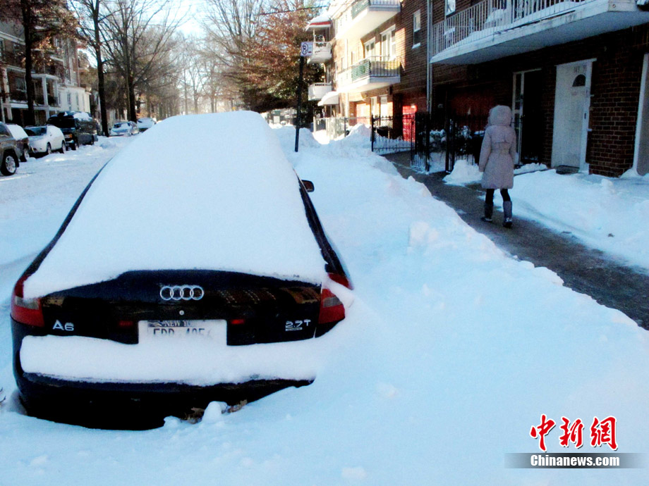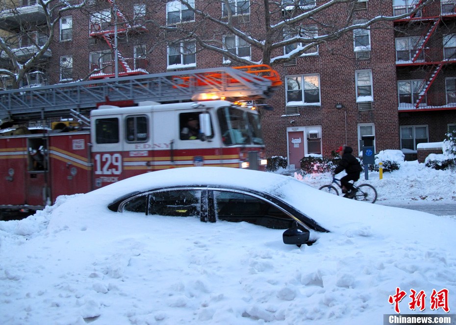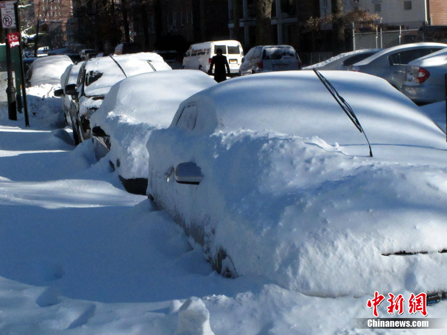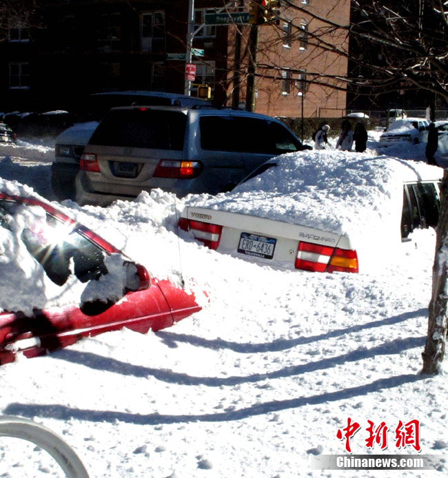 2010年12月27日,美國紐約,停在路邊的車輛陷入雪堆。暴風雪26日襲擊美國東海岸,紐約市區(qū)積雪達到50厘米,全市交通陷入困境。 中新社記者 孫宇挺 攝