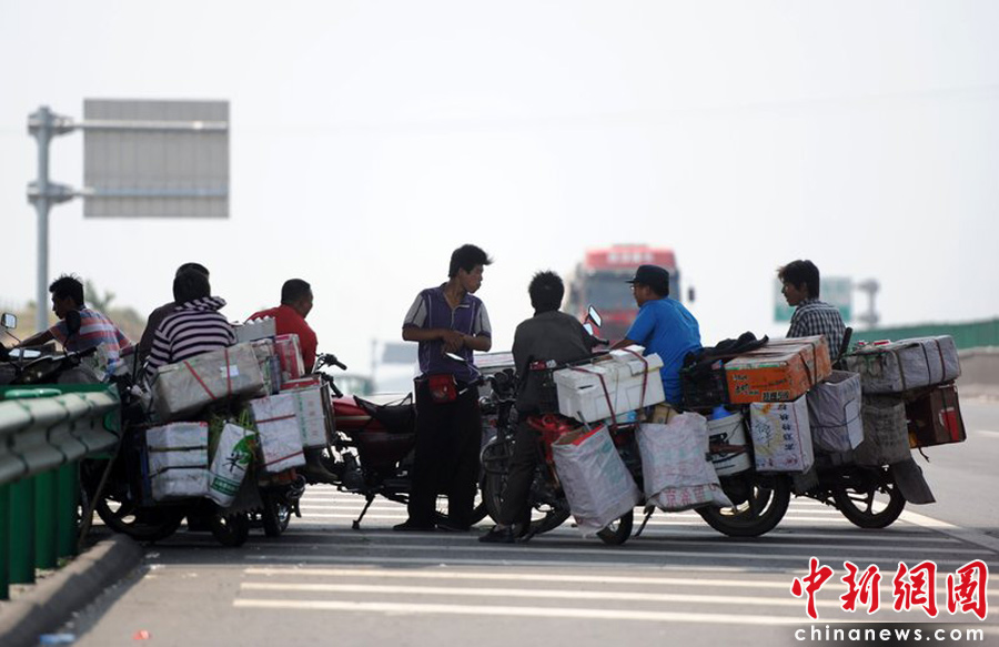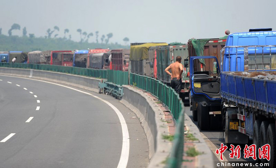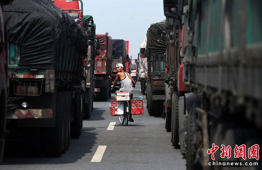 6月21日,施工20天的110國道延慶縣境內(nèi)的四座橋梁維修完畢,道路恢復暢通,但擁堵了20多天的京新高速,緩解情況卻不大。幾小時走上兩三公里的速度,實在讓人難以忍受,但長期跑這趟線路的大貨車車司機稱,車能走動,就已經(jīng)慶幸了,僅僅10幾公里的路,被堵三天三夜的情況以前是經(jīng)常出現(xiàn)。圖為23日在滯留的車隊中,不斷有開著摩托車的小販在大貨車之間穿插以做點生意。王苡萱/CFP