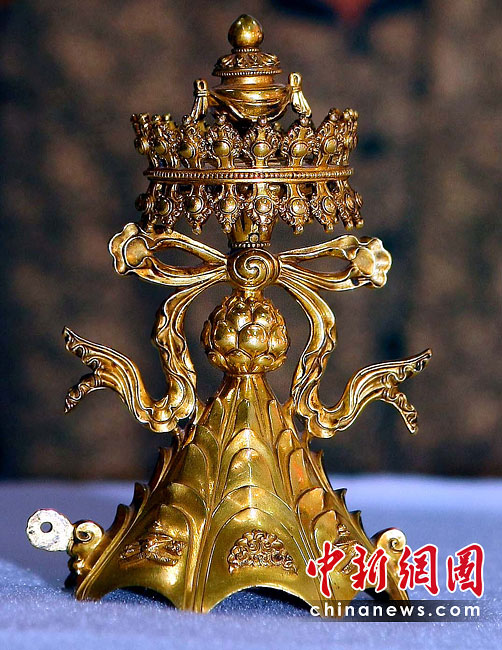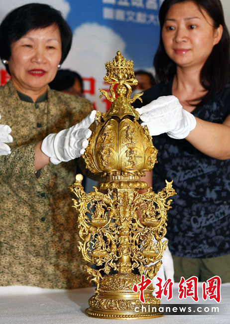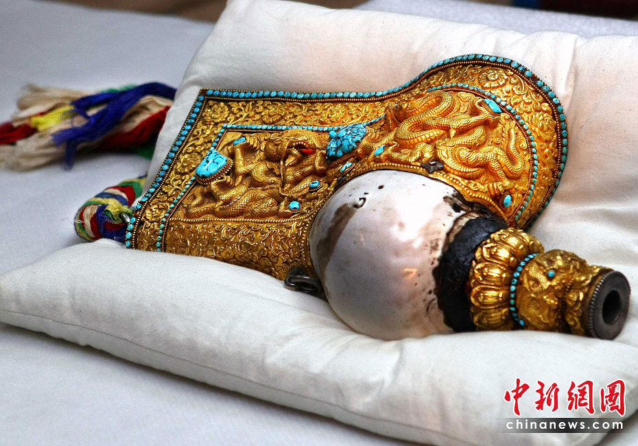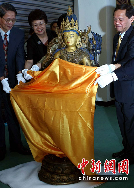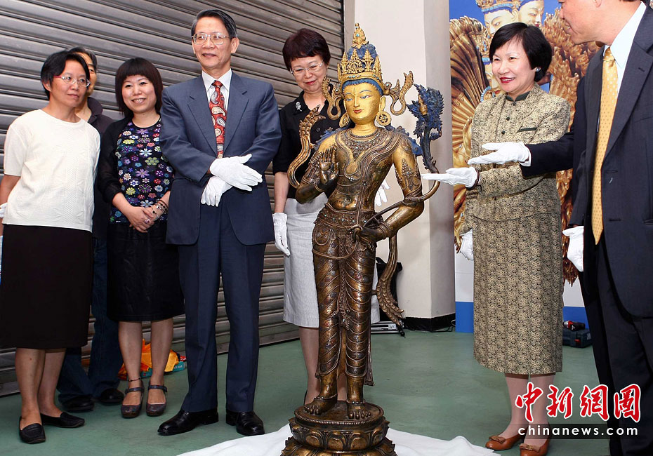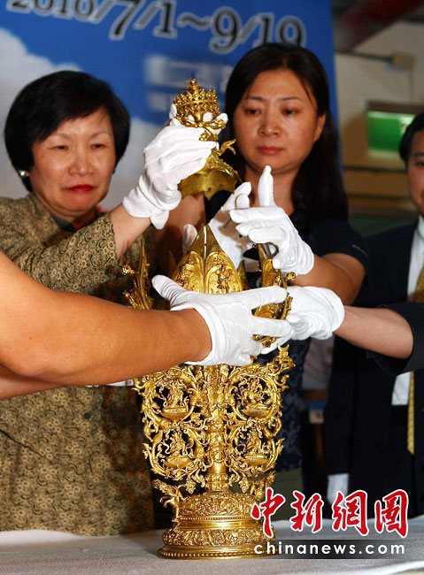 6月25日,工作人員將“鎏金銅彌勒菩薩像”、“金翅白海螺法號”、“八瓣蓮花曼荼鑼”等3件重量級文物開箱。7月1日,臺灣故宮博物院將舉辦“圣地西藏---最接近天空的寶藏”特展,展覽分“吐蕃王朝”、“金色寶藏”、“文化交流”、“雪域風情”四部分,共有130組件文物參展。中新社記者 宋吉河 攝