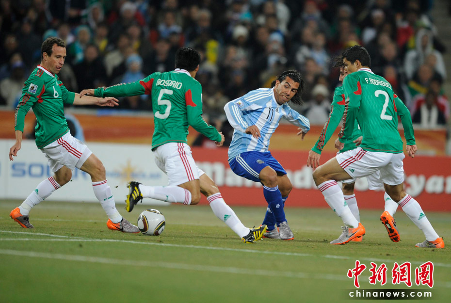 北京時間6月28日凌晨2:30,南非世界杯1/8決賽再賽一場,阿根廷隊在約翰內(nèi)斯堡的足球城球場迎來了墨西哥隊。憑借特維斯一個明顯越位進球首開紀錄,隨后伊瓜因和特維斯各進一球,以3-1擊敗墨西哥,晉級八強。 中新社記者 廖攀 攝