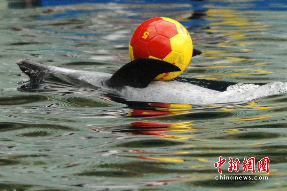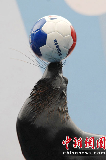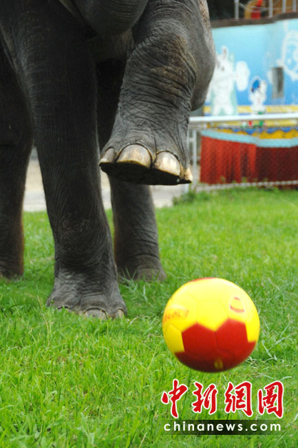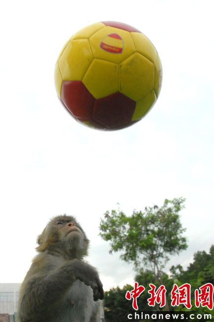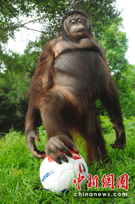 2010年南非世界杯六月底正在如火如荼地進(jìn)行,人們再次興起一輪熱愛足球的浪潮。居住在深圳野生動物園里的動物們也不甘落后,它們也紛紛玩起足球過把癮。中新社發(fā) 李木生 攝