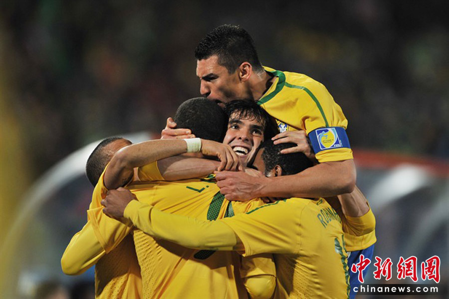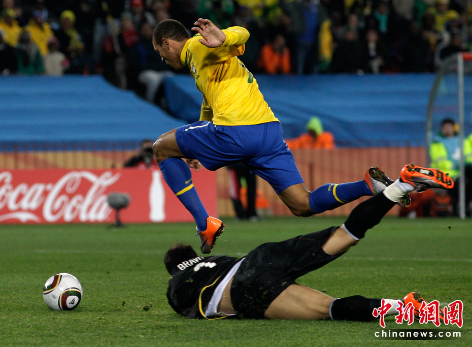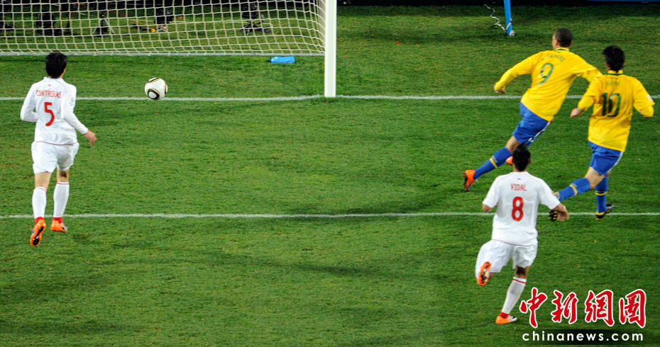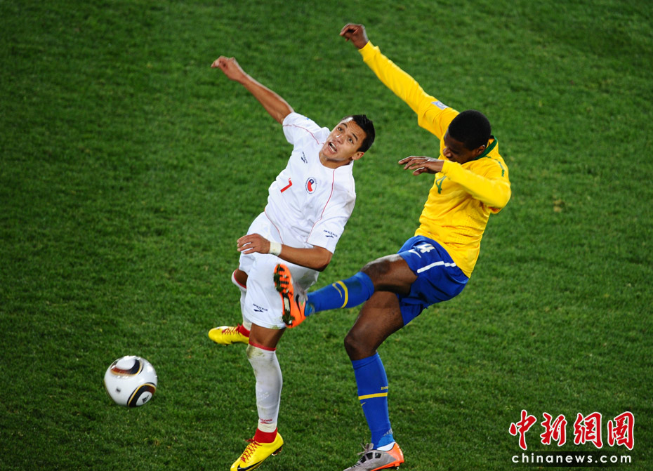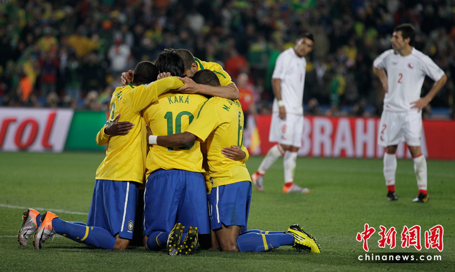 6月29日凌晨2:30,南非世界杯1/8決賽再戰(zhàn)一場。奪冠熱門巴西隊(duì)在約翰內(nèi)斯埃利斯公園球場迎來了南美兄弟智利隊(duì)。最終憑借胡安和法比亞諾的在上半場的進(jìn)球、羅比尼奧下半場錦上添花,巴西隊(duì)以3-0淘汰智利,晉級(jí)八強(qiáng)。