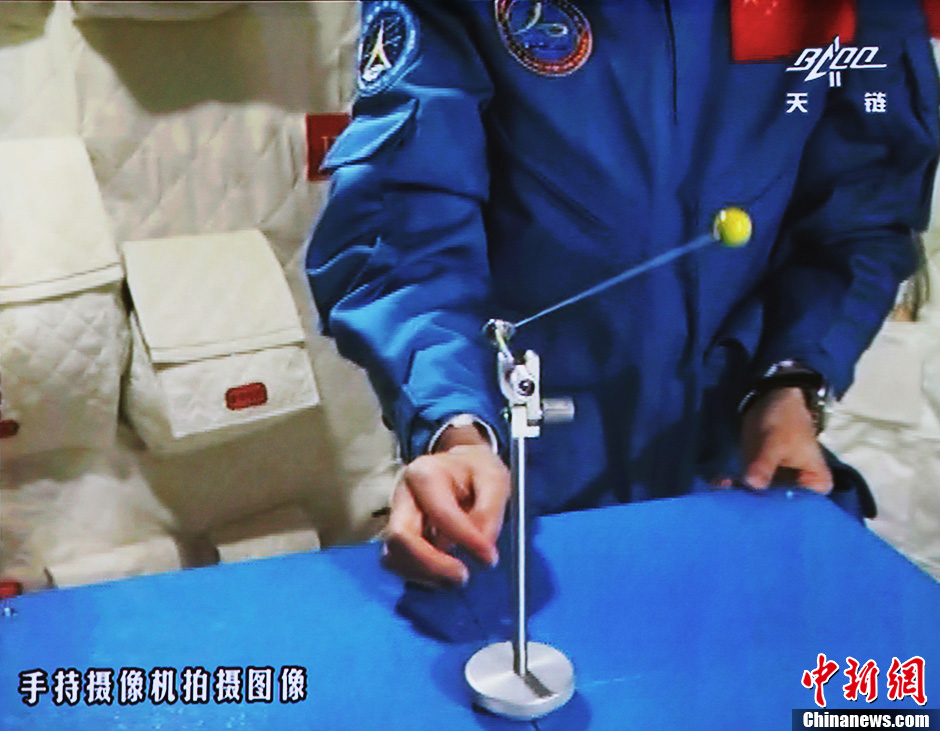6月20日10時(shí)許,神舟十號(hào)航天員在天宮一號(hào)開展基礎(chǔ)物理實(shí)驗(yàn),為青少年進(jìn)行中國首次太空授課。圖為王亞平講授太空失重提供條件下的單擺演示。中新社發(fā) 秦憲安 攝