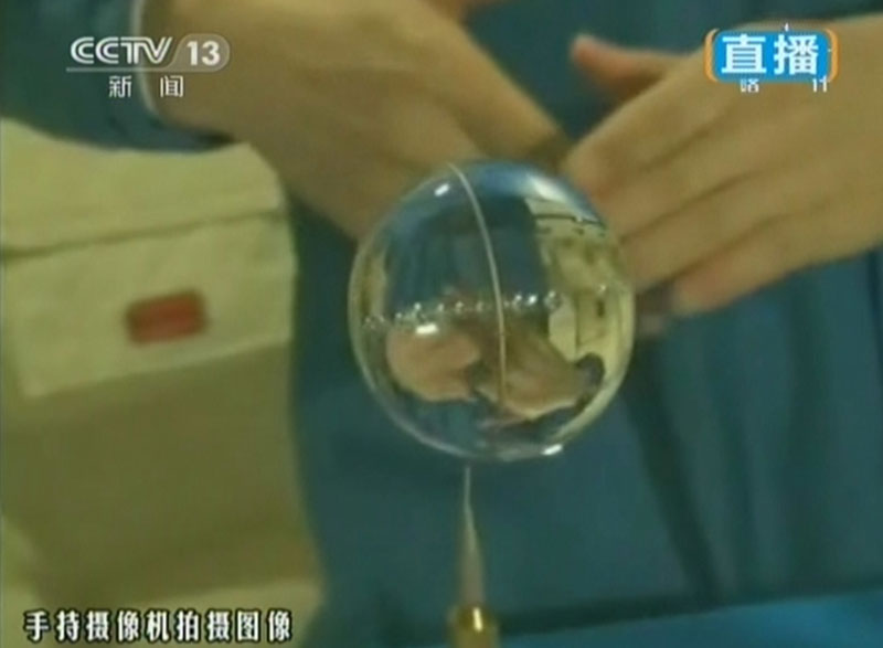 6月20日上午10時(shí)許,神舟十號(hào)航天員進(jìn)行中國(guó)首次太空授課,女航天員王亞平擔(dān)任主講,成為中國(guó)首位“太空教師”。圖為王亞平“玩水球”。(視頻截圖)