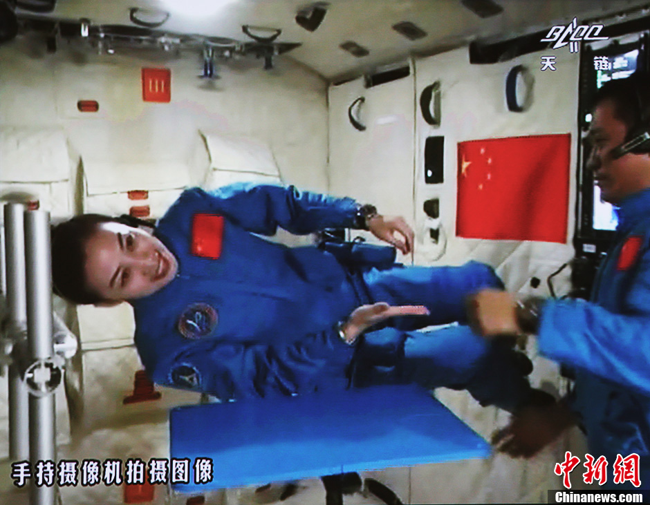 6月20日10時(shí)許,神舟十號(hào)航天員在天宮一號(hào)開展基礎(chǔ)物理實(shí)驗(yàn),為青少年進(jìn)行中國(guó)首次太空授課。圖為王亞平講授太空失重提供條件下的方位感演示。中新社發(fā) 秦憲安 攝