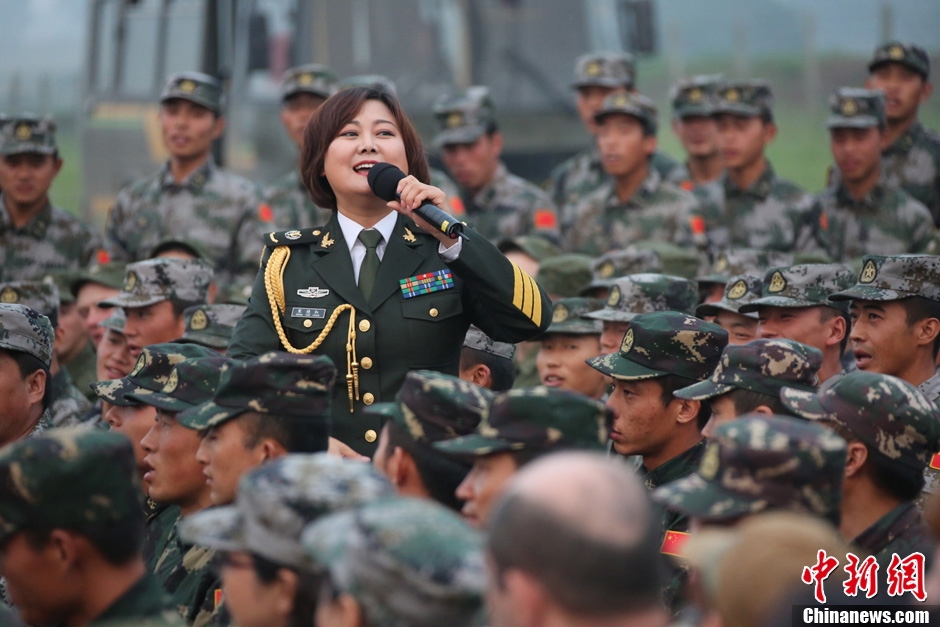 8月10日,隨同中方參演部隊赴俄羅斯參加“和平使命-2013”中俄聯(lián)演的沈陽軍區(qū)政治部文工團演員們,為中俄千余名參演官兵獻上了一場精彩的文藝晚會。豐富多彩的文藝節(jié)目,將位于切巴爾庫爾訓(xùn)練場的中俄聯(lián)演野營村,變成了友誼的盛會、歡樂的海洋。 圖為演唱歌曲《當(dāng)那一天來臨》。中新社發(fā) 李祥輝 攝